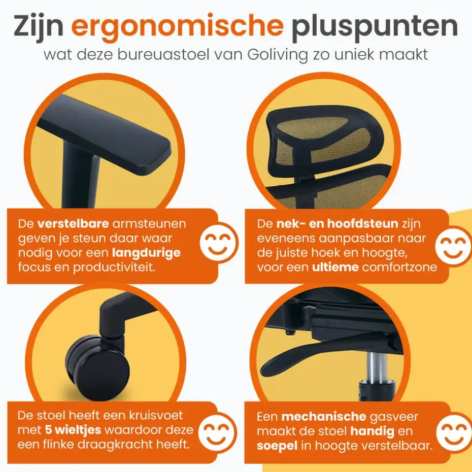 Een fijne werkplek is cruciaal om goed te kunnen presteren. Dat begint natuurlijk bij een degelijke bureaustoel. De bureaustoel is volledig te verstellen, en bevat ademend materiaal op de rugleuning en hoofdsteun. Deze stoel van Goliving is daarnaast uitgevoerd met een lendensteun, armsteunen en hoofdsteun, voor een ideale zitpositie. Je rug en postuur zullen je dankbaar zijn!