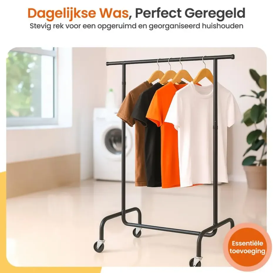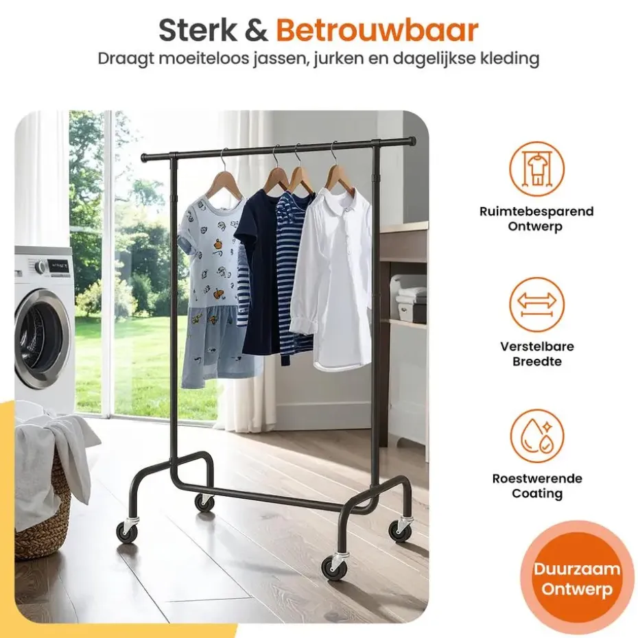 Of je nu je was wilt laten drogen, kleding netjes wilt presenteren of orde wilt scheppen in de slaapkamer, dit stevige kledingrek is er klaar voor. Dankzij de soepele wieltjes, verstelbare breedte en klikmontage heb jij in no-time een praktische opberger die je moeiteloos verplaatst en aanpast aan je ruimte.