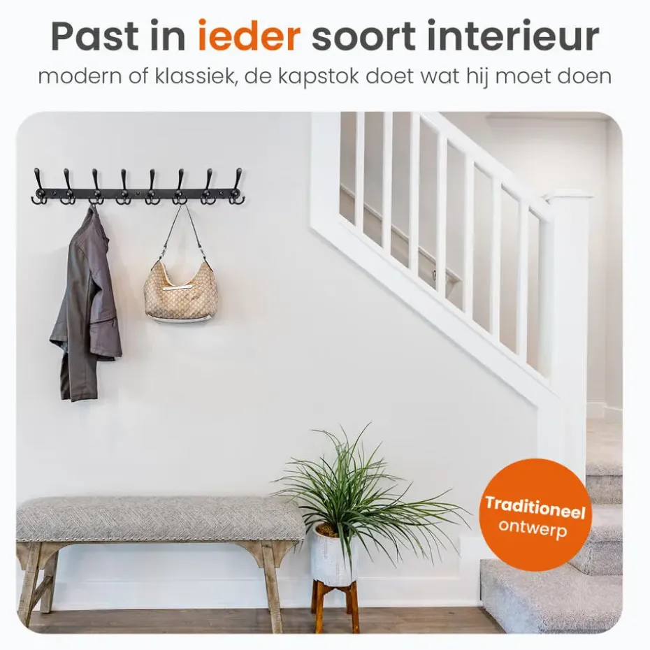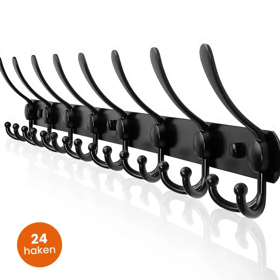Met maar liefst 24 haken biedt de kapstok genoeg ruimte voor jassen, sjaals, hoeden en meer. Ideaal voor grote gezinnen of als stijlvolle oplossing in gastenverblijven. Deze haken zijn strategisch geplaatst om maximale opbergruimte te bieden zonder in te leveren op design.