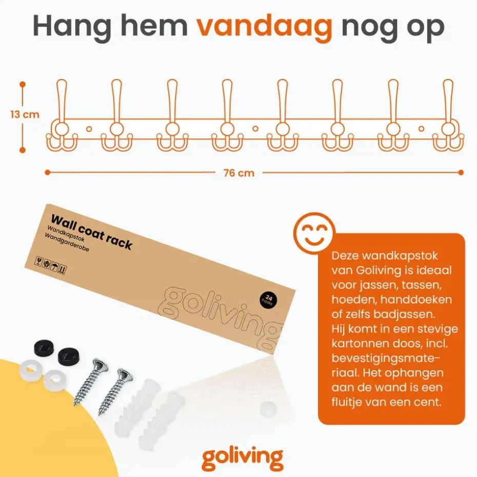 Deze hangende kapstok is ontworpen met het oog op ruimtebesparing. Hij neemt minimale ruimte in beslag maar biedt maximale opbergruimte. Bovendien wordt de kapstok geleverd met alle benodigde bevestigingsmaterialen, wat de installatie eenvoudig en snel maakt.