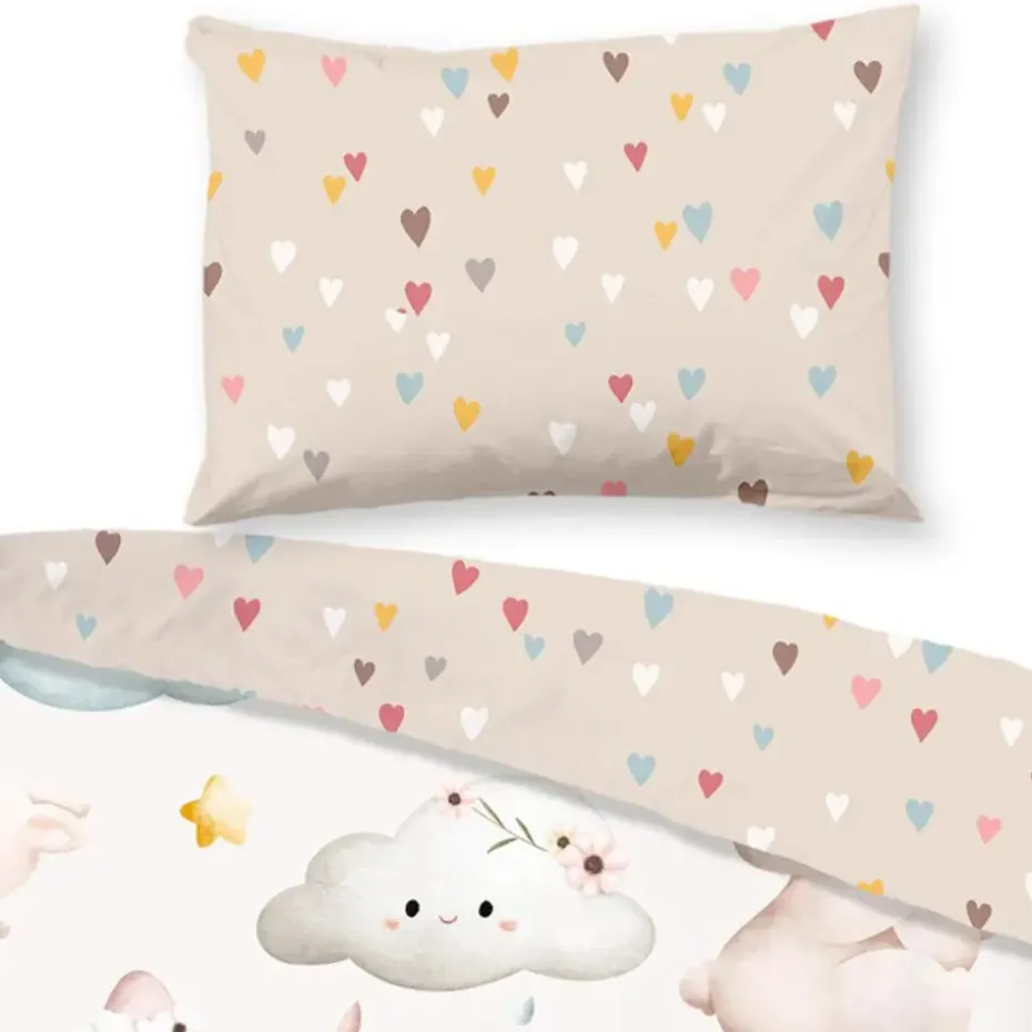 De bijpassende kussensloop is omgekeerd gestyled: een subtiel patroon van gekleurde harten op een zachte beige achtergrond, dat perfect aansluit op het overtrek maar toch eigenzinnig blijft.