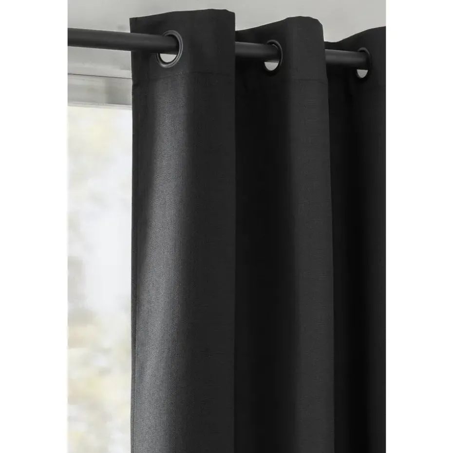 Verduisterend kant en klaar gordijn Kai zwart heeft een klassieke uitstraling en is gemaakt van 100% polyester. De gordijnstof heeft een weefstructuur en geeft daardoor een luchtige sfeer met zijn prachtige zwarte kleurtint.
