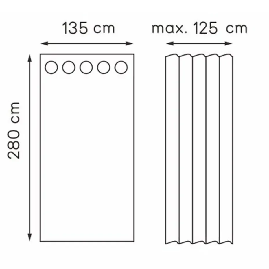 De gordijnstof is 135 cm breed. Als het aan de roede/rail hangt is het maximaal 125 cm breed