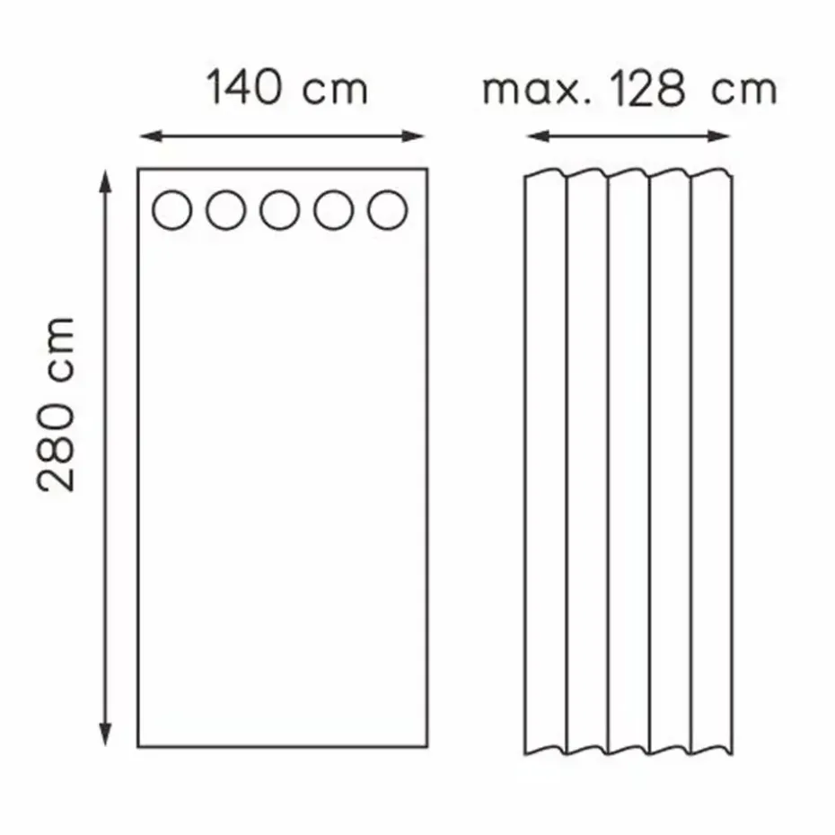 De gordijnstof is 140 cm breed. Als het aan de roede hangt is het maximaal 128 cm breed.