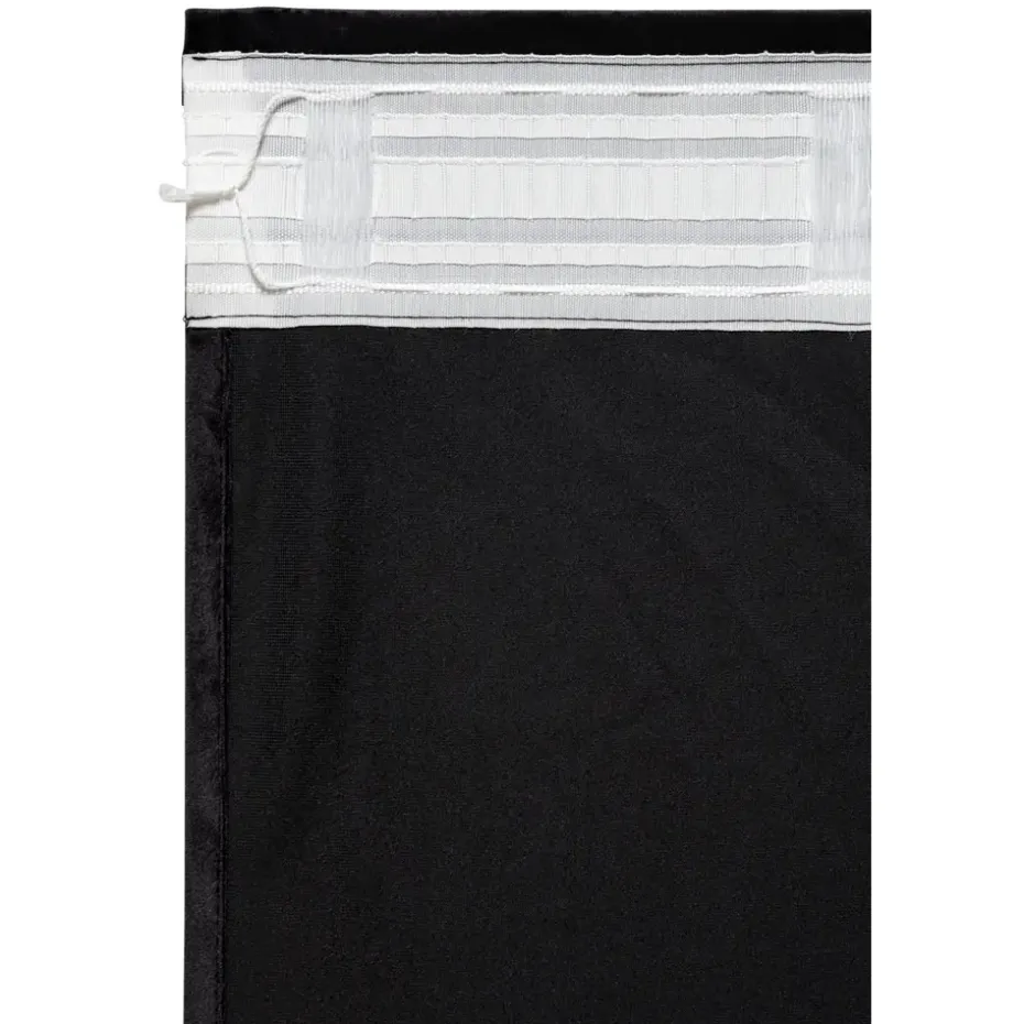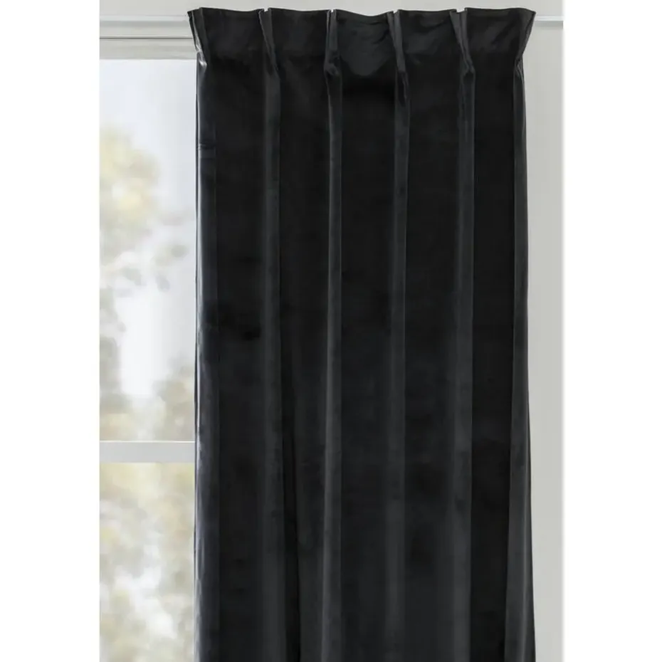 Verduisterend kant en klaar gordijn Yara zwart heeft een luxe uitstraling en is gemaakt van 100% polyester. De gordijnstof is velvet en geeft daardoor een warme sfeer met zijn prachtige zwarte kleurtint.