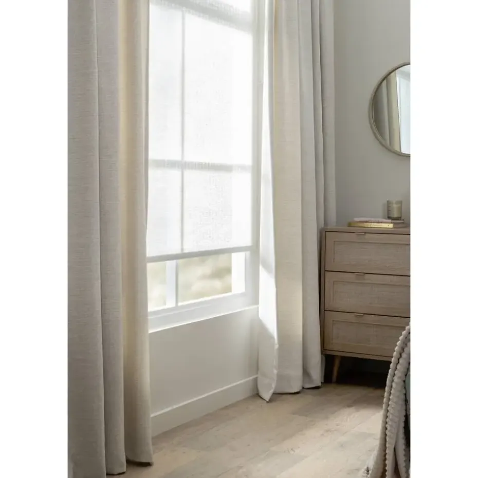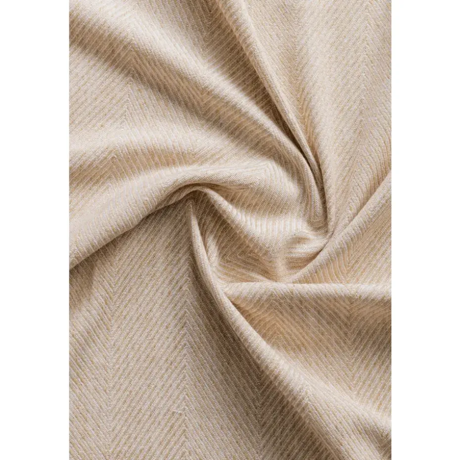 Lichtdoorlatende gordijnstof. Ecru. Met visgraat structuur. 140 cm breed.