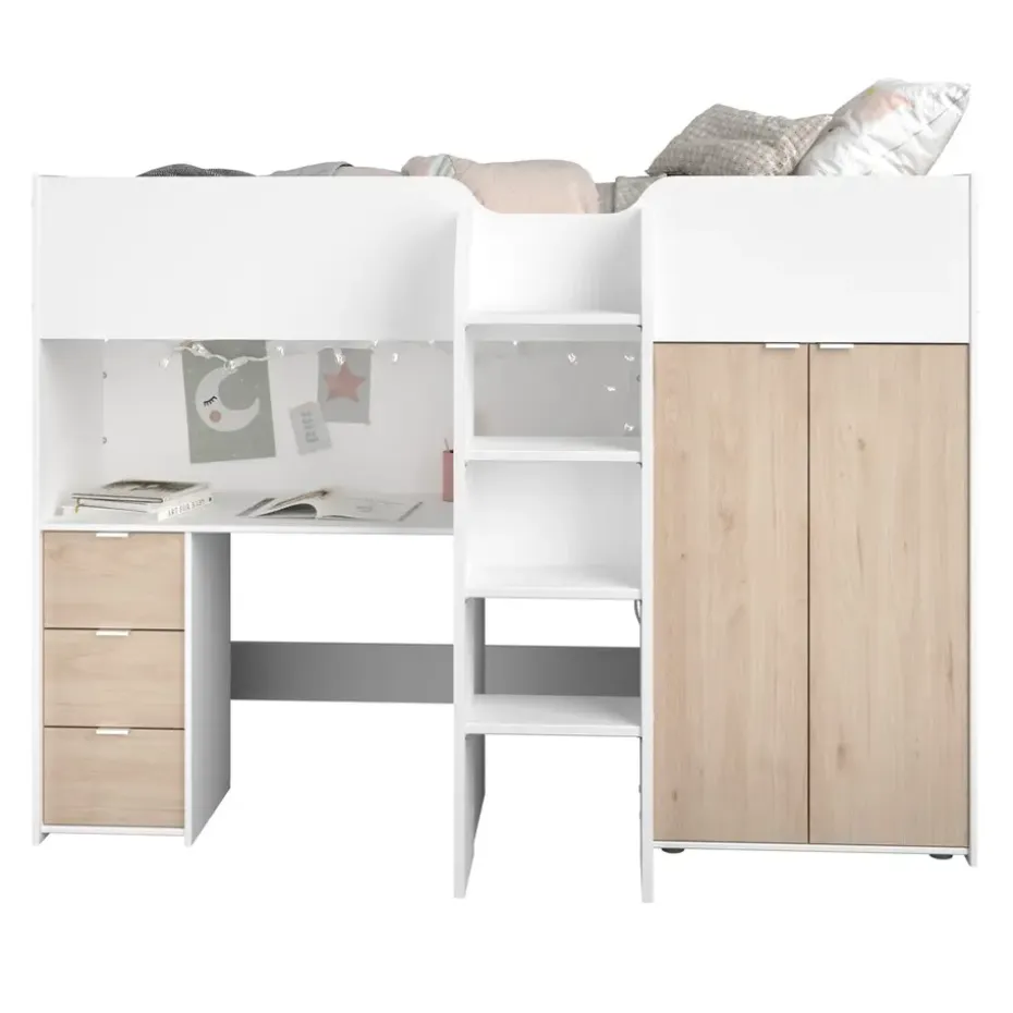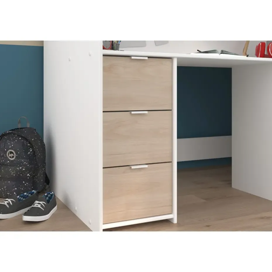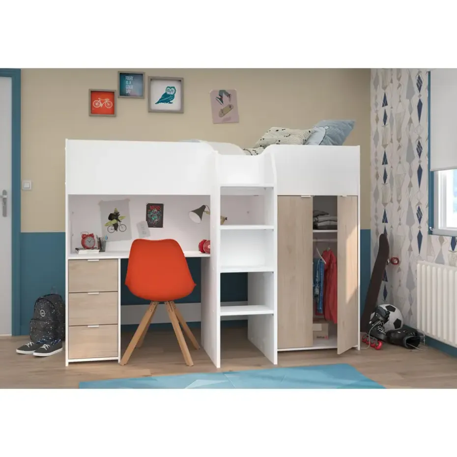 Halfhoogslaper Tristan bestaat uit een halfhoogslaper met bureau en lades en daarnaast ook nog een kast met deuren. De matrasmaat is 90x200cm en de halfhoogslaper is wit met eiken van kleur. Dit uiterst handige bed beschikt over voldoende opbergruimte en is tegelijkertijd erg leuk om te zien.