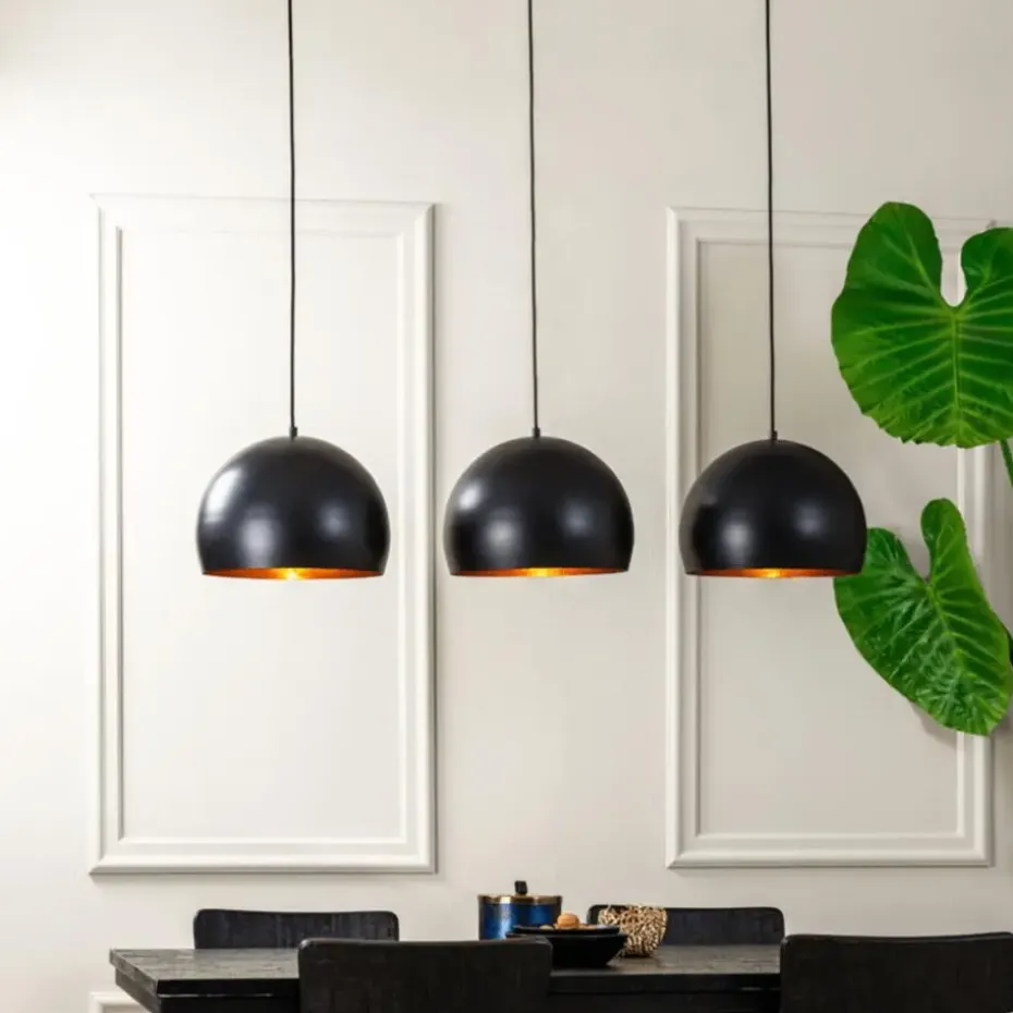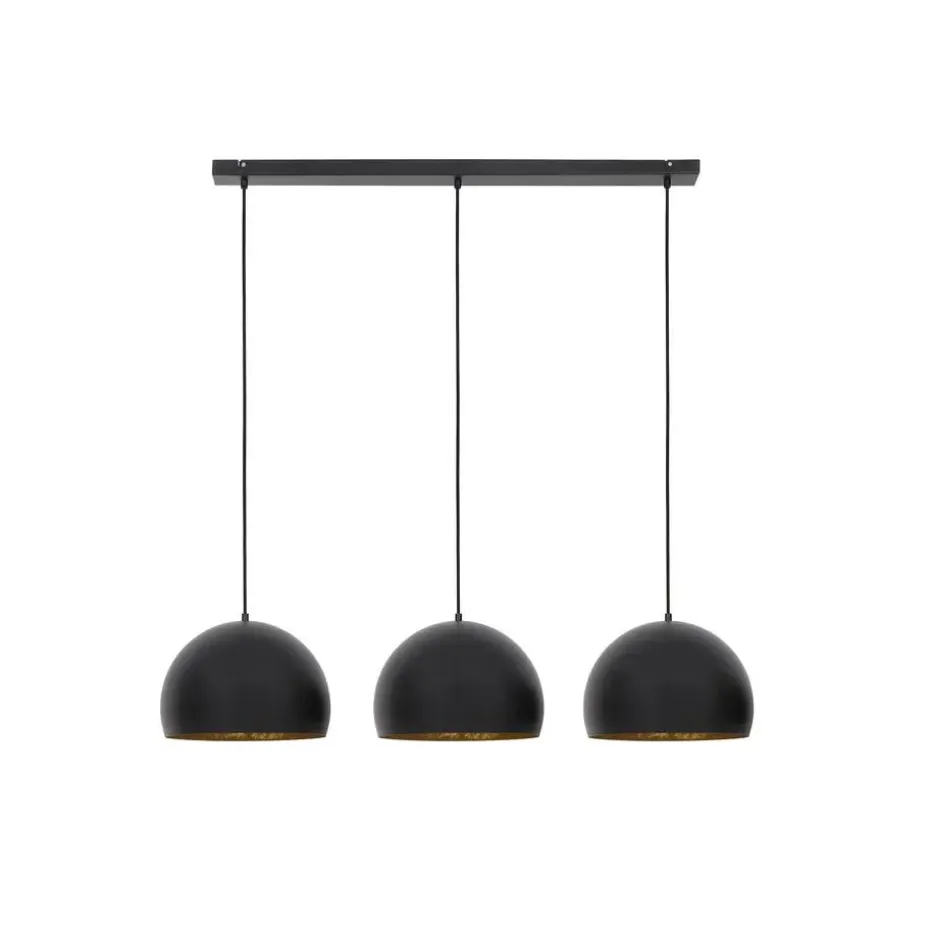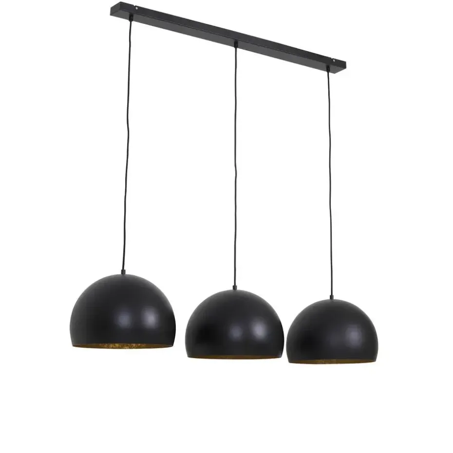 Deze trendy zwarte Jaicey hanglamp bestaat uit 3 lampen met een diameter van 45 cm, waardoor er een gezellige sfeer ontstaat in uw woonkamer of eetkamer. Naast het verlichten van uw woning, creëert de lamp een robuuste en moderne look met zijn metalen elementen. De metalen lampenkappen hebben een gouden afwerking, hangen aan een goudkleurig stoffen snoer en zijn in hoogte verstelbaar.