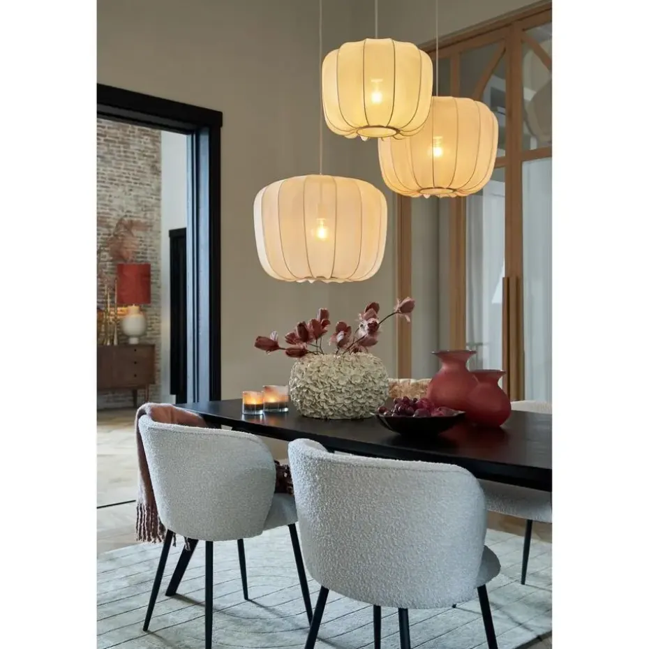 Dompel jezelf onder in een warme en uitnodigende sfeer met de Plumeria hanglamp. Deze elegante lamp heeft een uniek kapontwerp met een zachte, zandkleurige textiele drapering rond een stevig metalen frame. Met een diameter van 40 cm creëert deze lamp een zachte en uitnodigende gloed, perfect om te relaxen in je slaapkamer of een vleugje verfijning toe te voegen aan je woonkamer. De combinatie van de natuurlijke textuur van de stof en de industriële touch van het metalen frame creëert een visueel intrigerend stuk dat past bij verschillende interieurstijlen.