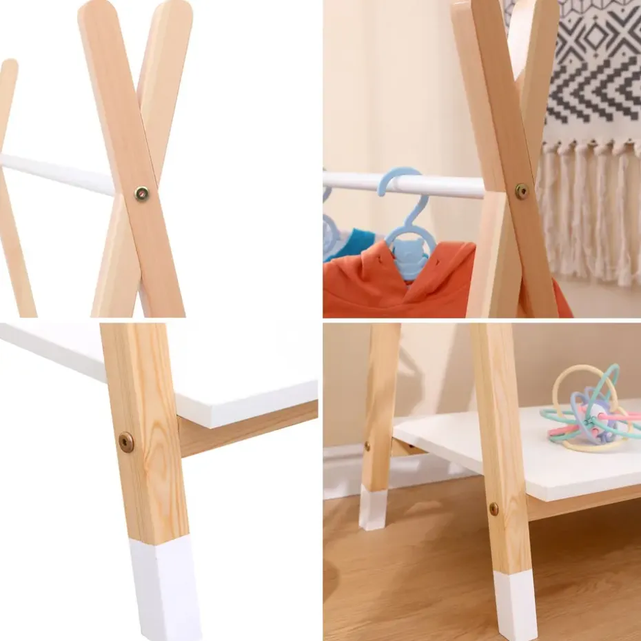 Kies dit kinderrek om de kleding van uw kinderen dagelijks op te bergen. Het is perfect om gemakkelijk een grote of kleine kamer in te richten. Het past ook goed bij elke kamerdecoratie. Met zijn natuurlijke dennenhouten structuur biedt hij een trendy Scandinavische stijl die geschikt is voor elk interieur. De jasjes, t-shirts en truien van uw kleintjes kunt u gemakkelijk ophangen met hangers. Op een lage plank kunt u naar wens pantoffels, speelgoed of decoratieve voorwerpen kwijt. De kinderkledingkast LOU is een praktische opbergoplossing in alle omstandigheden.