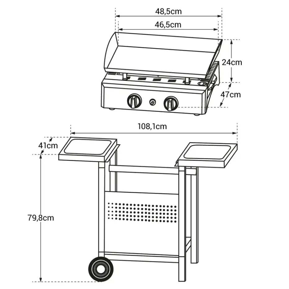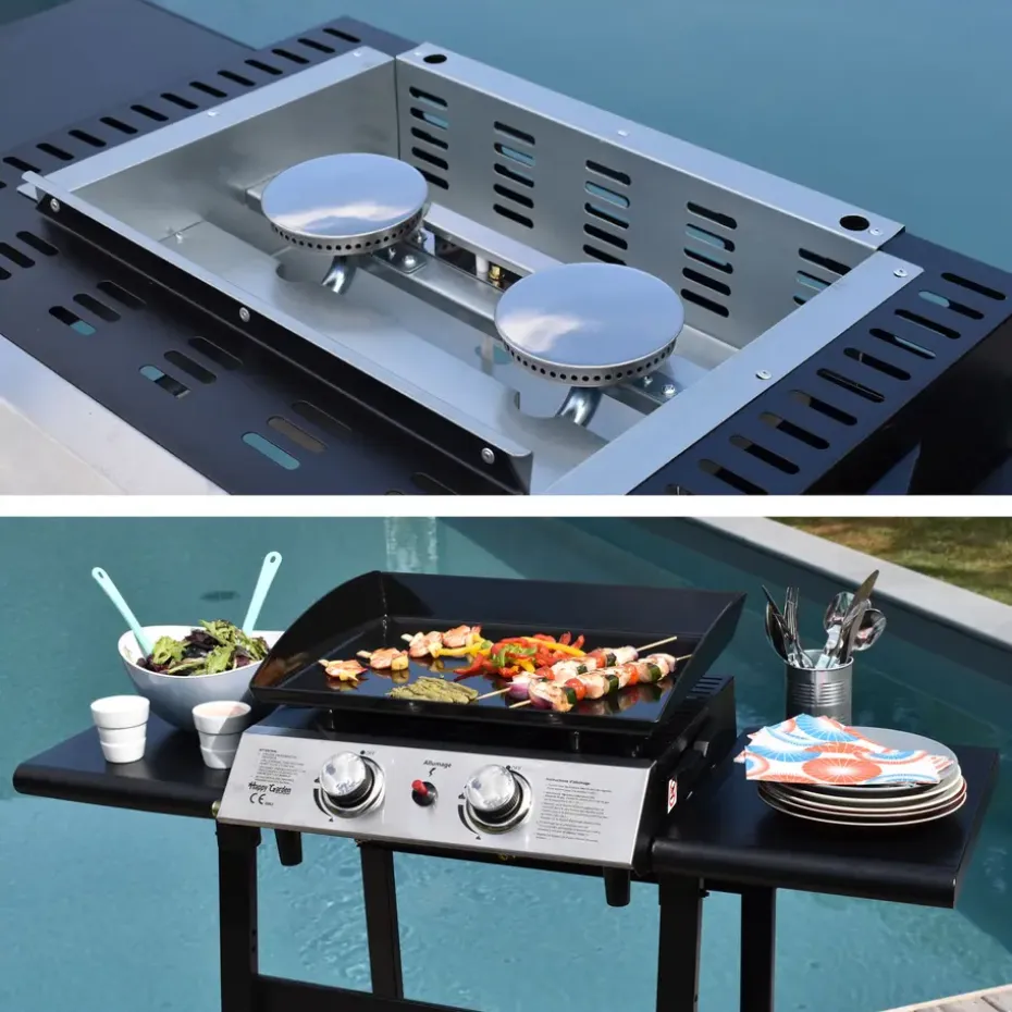 De gasbakplaat is het meest gebruiksvriendelijke kooktoestel! De 2 branders en de geëmailleerde plaat zorgen voor een homogene bereiding van uw voedsel, voor een gezonde en smakelijke maaltijd. Gemakkelijk te verplaatsen met zijn trolley op wieltjes, u kunt hem eruit halen wanneer u maar wilt om hem naast uw tuinmeubelen te zetten. Bovendien kunt u met de trolley tegelijkertijd uw gasfles vervoeren, terwijl u deze verbergt. Tenslotte zullen de twee legplanken zeer nuttig zijn om uw servies, uw accessoires en uw kruiden op te zetten, zodat u ze binnen handbereik hebt.