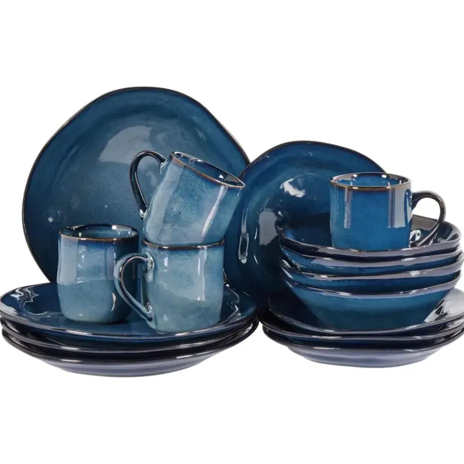 Handgemaakt dinerservies voor 4 personen. Deze 16-delige serviesset van steengoed voor 4 personen combineert vintage charme met moderne functionaliteit. De rijke blauwe tint met bruine randen en de prachtige afwerking met reactief glazuur geven elk handgemaakt stuk een unieke, onregelmatige vorm voor een echt retrogevoel. De set bestaat uit dinerborden, bijzetborden, diepe borden en mokken, perfect voor elke gelegenheid. Ze zijn geschikt voor de magnetron en de vaatwasser en bieden moeiteloos gemak terwijl ze karakter en elegantie toevoegen aan elke maaltijd.