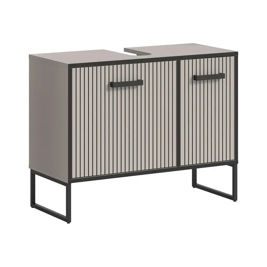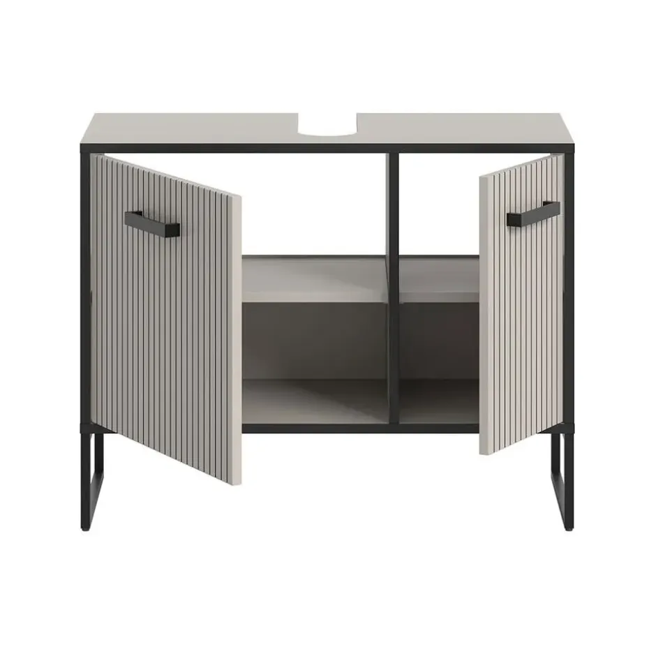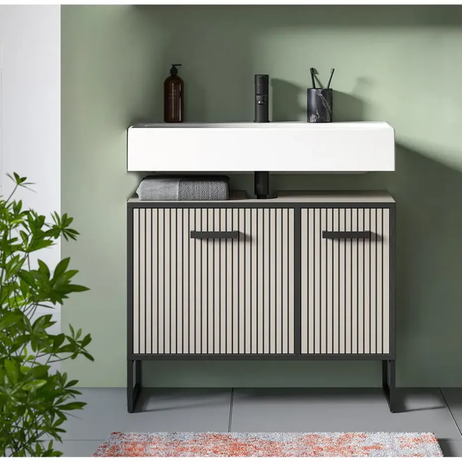 De Bagno wastafelmeubel combineert moderne esthetiek met praktische functionaliteit. Hij is ontworpen in een elegante lichtgrijze kleur met crèmekleurige lamellenfronten en een zwarte metalen behuizing, wat een verfijnde en stijlvolle uitstraling aan uw badkamer geeft.