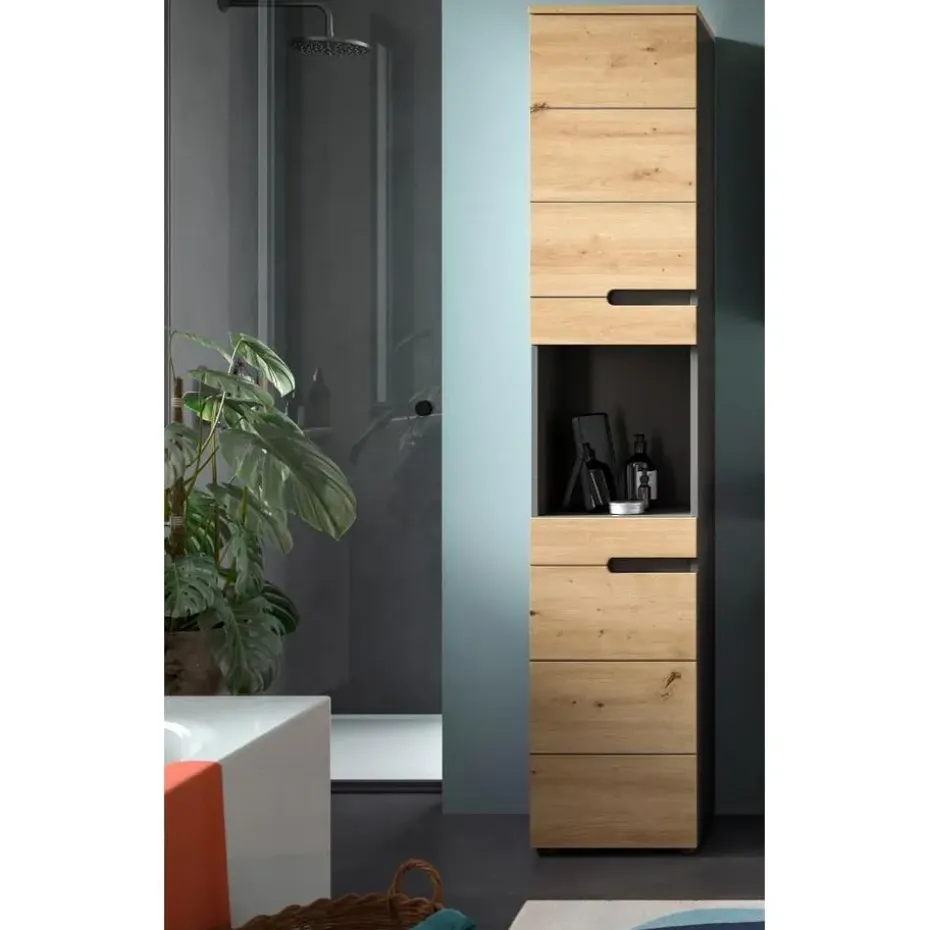 Canu kolomkast 2 deuren, 1 plank eiken decor, grijs. Deur omkeerbaar. Deur met Softclose. Deze hoge kast (B/H/D: 38x193x34 cm) overtuigt door zijn moderne materiaalmix: een ambachtelijke houtafwerking en een elegant zwart interieur. Deze combinatie geeft de kast een stijlvol en tijdloos design dat elke badkamer complementeert. Met twee deuren en diverse planken biedt de kast voldoende opbergruimte voor handdoeken, toiletartikelen en andere badkamerartikelen. De robuuste constructie met massieve planken zorgt voor stabiliteit en duurzaamheid. Een bijzonder hoogtepunt is de flexibele installatie, aangezien de kast zowel links als rechts kan worden gemonteerd. Gemaakt van FSC®-gecertificeerd houtmateriaal is dit meubel niet alleen hoogwaardig, maar ook duurzaam. Creëer orde en stijl in uw badkamer met deze hoogwaardige hoge kast die functionaliteit en milieubewustzijn combineert!