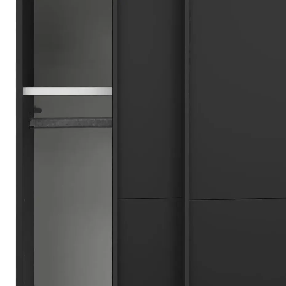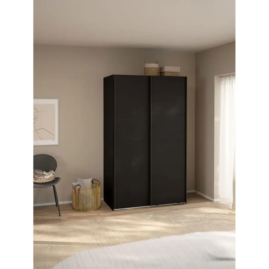 De Catania schuifdeurkast in matzwart is een compacte en stijlvolle oplossing voor moderne woningen waar de ruimte optimaal benut moet worden. Met zijn afmetingen van 120×200 cm past de kast perfect in kleinere slaapkamers, gangen of tienerkamers, zonder in te leveren op functionaliteit. De twee schuifdeuren schuiven soepel en nemen geen extra ruimte in beslag vóór de kast – ideaal voor smalle ruimtes. De matzwarte afwerking zorgt voor een exclusieve en tijdloze uitstraling die perfect te combineren is met zowel lichte als donkere interieurkleuren. Binnenin is de kast voorzien van zowel een kledingroede als planken, wat zorgt voor veel opbergruimte.