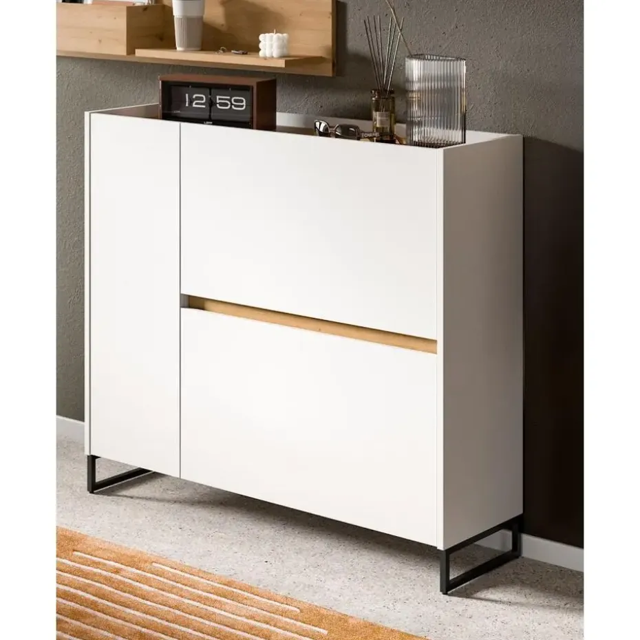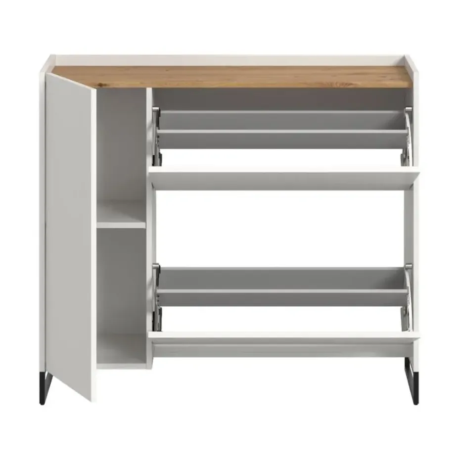 Drive schoenenkast 1 deur, 2 vouwdeuren wit. Aantal paar schoenen: 9. Deur Softclose. Deze schoenenkast (97x110x32 cm) in wit met een Artisan Oak-afwerking heeft één deur, één in hoogte verstelbare plank, twee vakken en twee schoenenplanken voor circa 12 paar schoenen. FSC®-gecertificeerd houtmateriaal garandeert duurzaamheid. Het onderhoudsvriendelijke oppervlak en de snelle montage zorgen voor gemak. Perfect uit te breiden met andere artikelen uit dezelfde serie. Voor een georganiseerd en stijlvol huis.