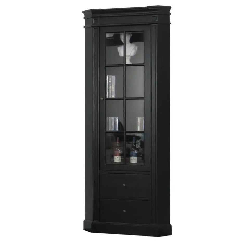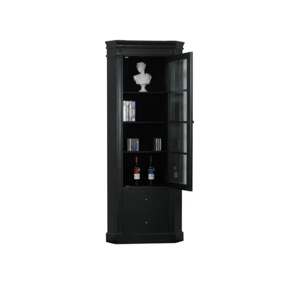 Amaretta hoekkast breedte 78 cm, hoogte 200 cm zwart antiek gepatineerd is een vitrinekast in de kleur zwart die zowel stijl als functionaliteit in uw huis brengt. Prachtige hoekkast uit onze populaire meubelserie Amaretta. De kast is gemaakt van massief hout dat zwart geverfd is en een antieke patina heeft. De handgrepen zijn van metaal in antieke stijl, de kast heeft 3 planken en 2 lades. De Amaretta serie is gemaakt van goede materialen met oog voor detail. Solide kwaliteitsmeubels met ziel. Stijlvol ontwerp met antieke patinatie. Een kwaliteitsmeubel, stijlvol, charmant en solide. Dit product is gemaakt met oog voor detail, wat zowel esthetische aantrekkingskracht als hoge duurzaamheid garandeert. Het is ontworpen met zowel functionaliteit als stijl in gedachten, waardoor het de perfecte keuze is voor elke kamer in uw huis. De gebruikte materialen zijn van hoge kwaliteit, waardoor het product een lange levensduur heeft en bestand is tegen dagelijks gebruik. Of het nu voor opslag is of als decoratieve toevoeging, dit product zal uw interieur naar een hoger niveau tillen en extra comfort en elegantie in uw huis brengen.