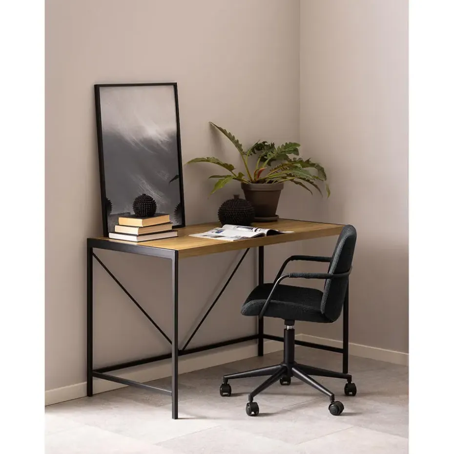 Het Bahamas bureau combineert een eenvoudig en functioneel ontwerp met een warme, natuurlijke houten afwerking. De robuuste tafel heeft een stijlvol metalen frame in de kleur zwart, wat een modern contrast creëert met het naturel houten tafelblad. Met zijn open en luchtige structuur geeft dit bureau een minimalistische uitstraling die perfect past in zowel het thuiskantoor als de studeerkamer. Het biedt een goed werkoppervlak en voldoende opbergruimte voor gereedschap en decoraties, waardoor het een ideale keuze is voor mensen die waarde hechten aan zowel esthetiek als functionaliteit.