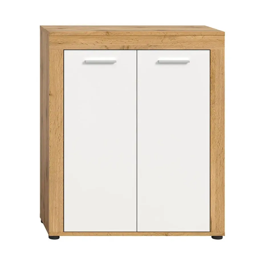 Achter de twee deuren vindt u voldoende opbergruimte voor dagelijkse schoenen, zodat de entree netjes en overzichtelijk blijft. De slanke, metaalkleurige handgrepen zorgen voor gemakkelijke toegang en de zwarte pootjes tillen de kast gemakkelijk van de vloer, wat schoonmaken vergemakkelijkt. Het compacte formaat maakt de kast gemakkelijk te plaatsen, zelfs in kleinere ruimtes.