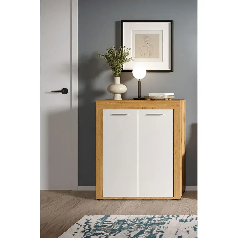 De Jam schoenenkast met 2 deuren combineert functionaliteit met een moderne en warme uitstraling. De kast heeft witte fronten en een decoratief frame in eikenlook, wat zorgt voor een natuurlijk en uitnodigend contrast. Met zijn eenvoudige design past de kast perfect in zowel moderne als klassieke entrees.
