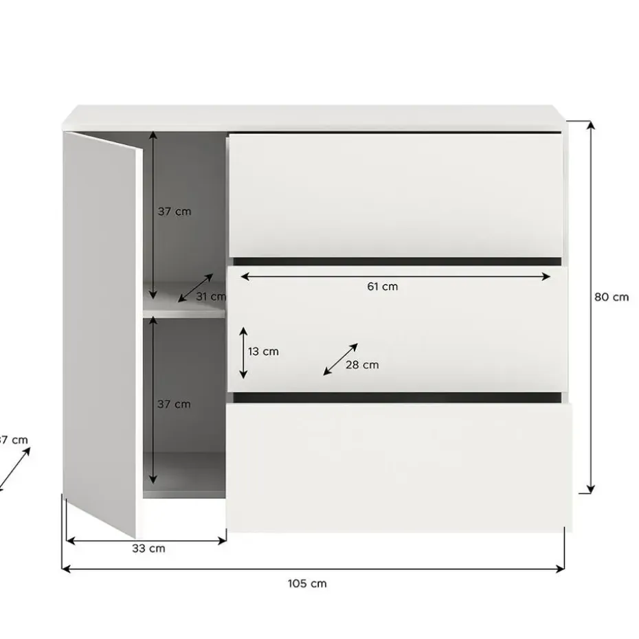 Loft dressoir 3 laden 1 deur wit. Deur Duw om te openen. Losse planken: 1. Dit moderne opbergmeubel biedt een praktische combinatie van planken en lades voor opbergruimte. Met een stijlvol ontwerp en compacte afmetingen is hij ideaal voor zowel kleine als grote kamers. Het wit gelakte oppervlak geeft een strakke en minimalistische uitstraling die perfect past in woonkamers, kantoren en slaapkamers.