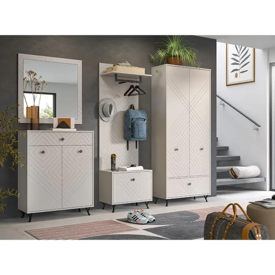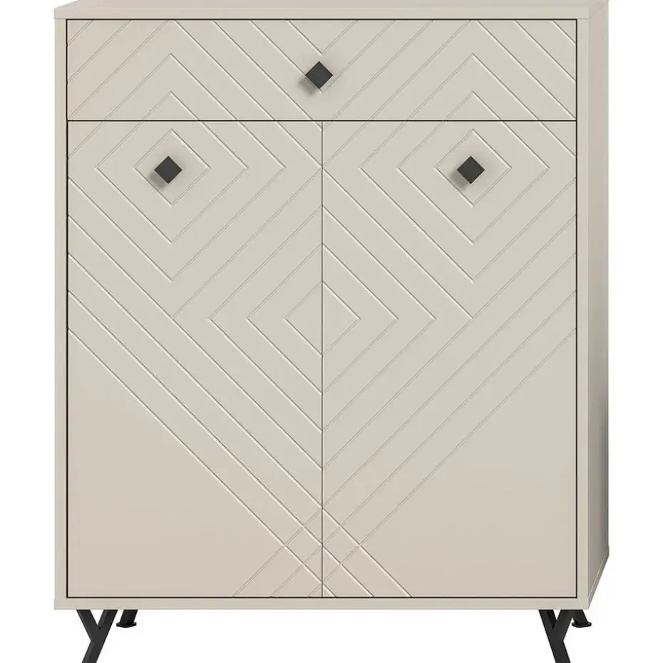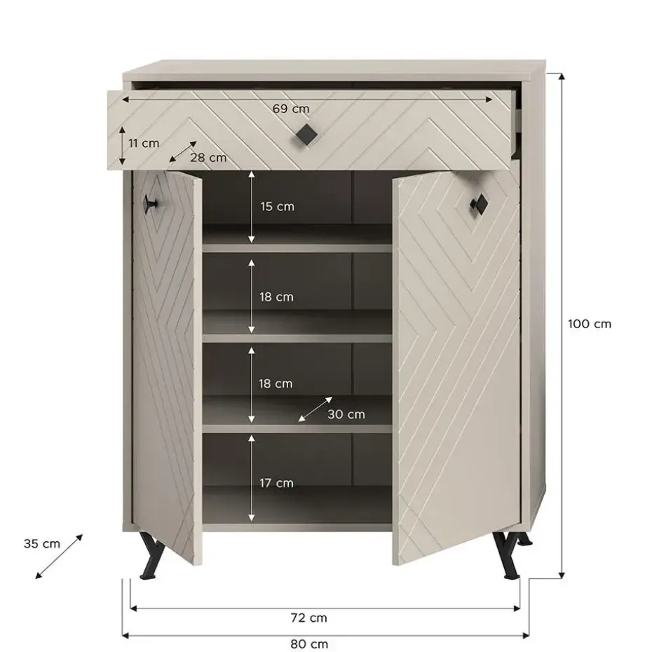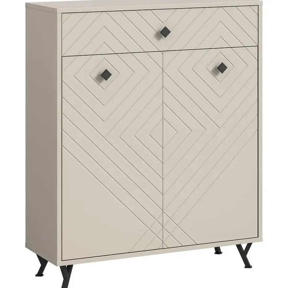 Opmerkingen schoenenkast 2 deuren mat beige. Losse planken: 3. Deze moderne opbergkast combineert functionaliteit en stijl in een elegant design. Met zijn praktische opbergoplossing, waaronder een ruime lade en verschillende planken, biedt deze kast je voldoende ruimte om kleding, schoenen of andere spullen te ordenen. De verfijnde geometrische decoratie op de deuren en lade, evenals de elegante poten, maken dit kastje tot een perfecte aanvulling op je huis. De kast is ideaal om orde en stijl te brengen in uw slaapkamer, hal of woonkamer.