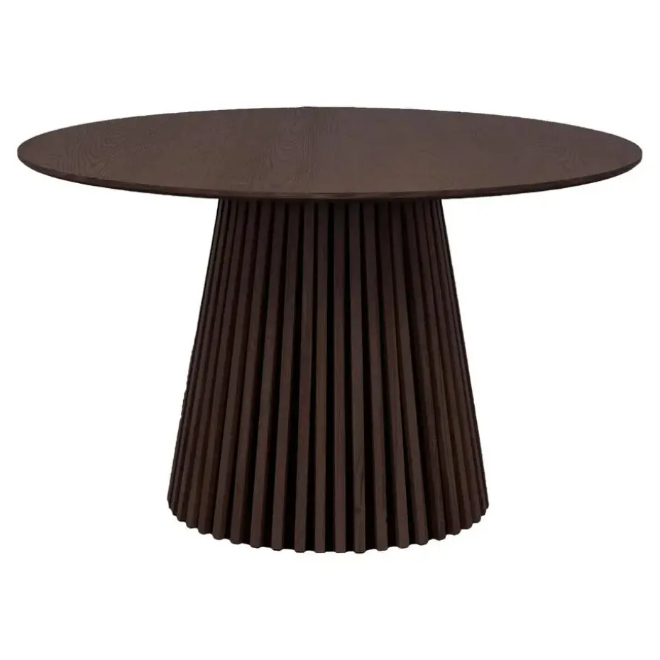 Deze ronde eettafel in donker hout straalt luxueuze eenvoud en verfijning uit. Met zijn strakke en moderne design is de tafel perfect voor het creëren van een uitnodigende en stijlvolle eethoek. Het stabiele onderstel bestaande uit verticale houten latten zorgt voor zowel esthetiek als functionaliteit, terwijl het tafelblad voldoende ruimte biedt voor zowel kleine als grote maaltijden.