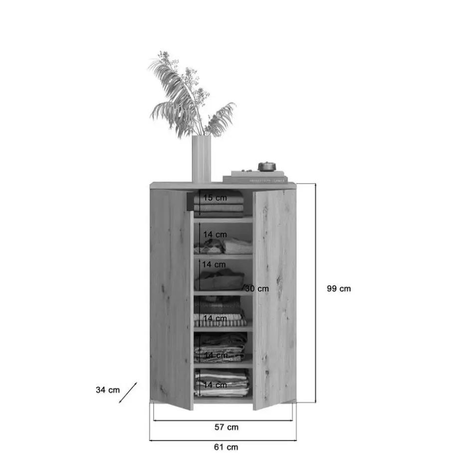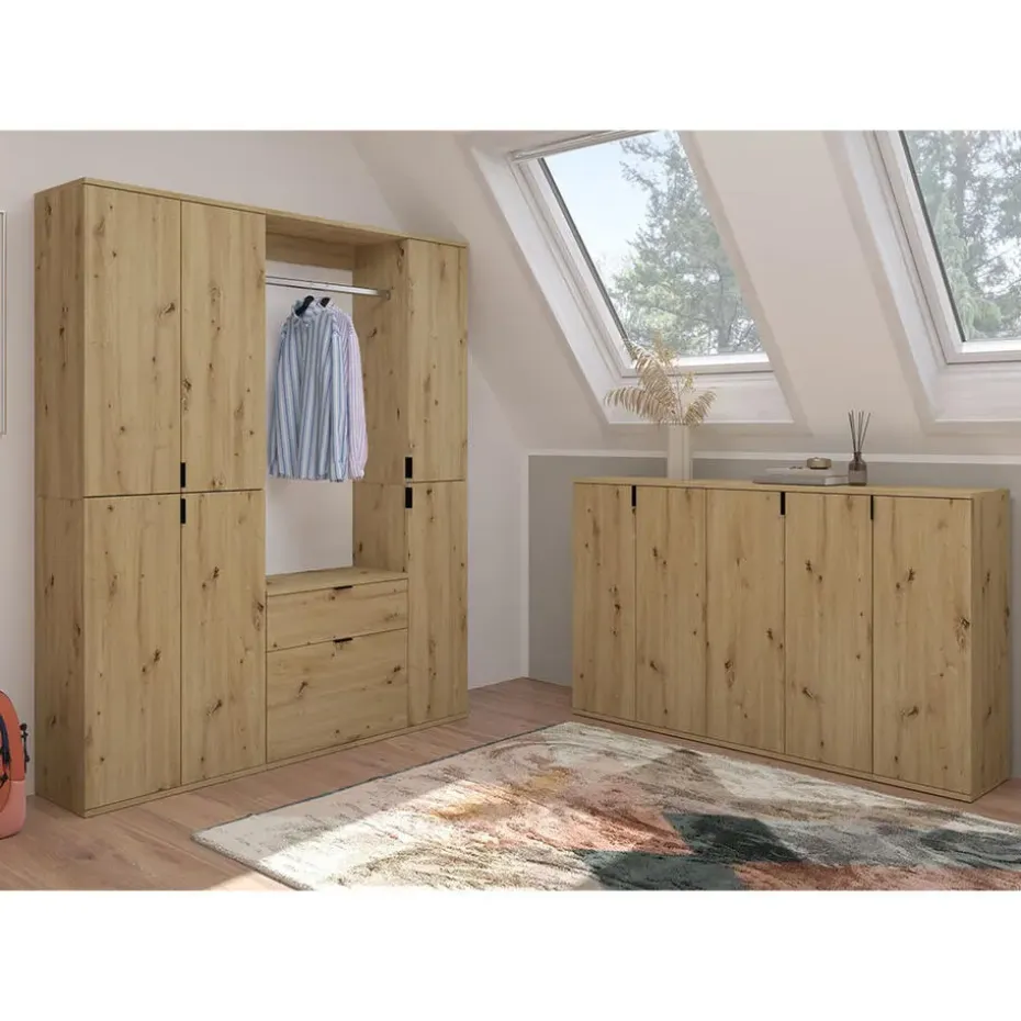 ProjektX ladekast 2+2 deuren 4 deuren eiken decor. Losse planken: 1. Deze opbergkast is een stijlvolle en functionele oplossing die perfect past in zowel moderne als klassieke woningen. Met zijn natuurlijke houtafwerking en eenvoudig ontwerp biedt hij veel opbergmogelijkheden met vier deuren die een ruim interieur verbergen. Door de elegante constructie is het niet alleen een opbergmeubel, maar ook een decoratieve toevoeging aan de woonkamer, hal of slaapkamer.