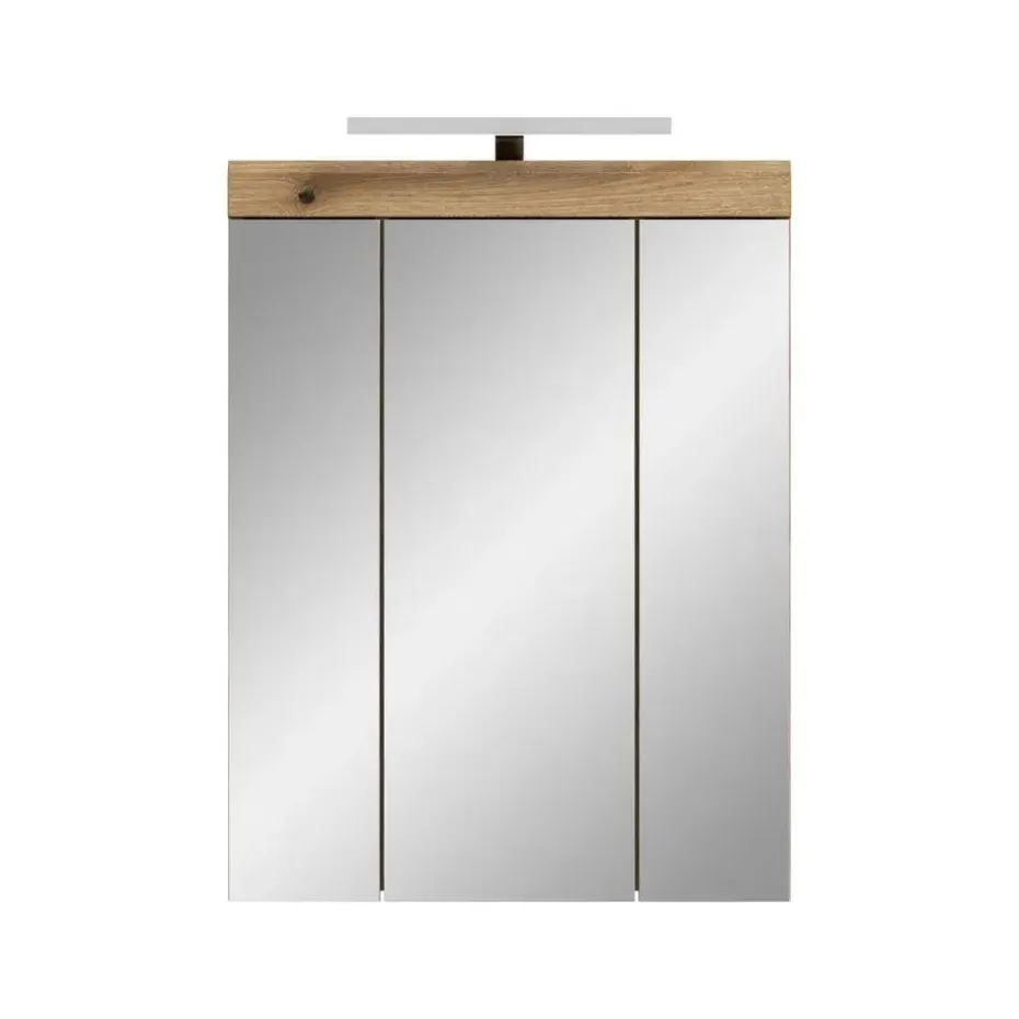 Scout spiegelkast inclusief verlichting 3 spiegeldeuren eiken decor. Deur omkeerbaar. LED. 6 kWh/1000h. 400 Lumen. 6 Watt. 30.000 uur. Kelvin 5000. EEF: G. LED kan niet worden vervangen. Deze tweedelige combinatie van een spiegelkast en badkamerlamp in Evoak Oak-afwerking en spiegelglas (60 x 79 x 18 cm) combineert praktische opbergruimte met stijlvolle verlichting. De spiegelkast heeft een eenvoudig te reinigen front van hoogwaardig spiegelglas dat uw badkamer een moderne uitstraling geeft. De geïntegreerde badkamerlamp zorgt voor optimale verlichting bij het maken van make-up of scheren. Met negen gesloten vakken en zes in hoogte verstelbare planken biedt de kast voldoende ruimte voor cosmetica en toiletartikelen. De robuuste constructie garandeert duurzaamheid. Deze combinatie is de ideale keuze voor een functionele en stijlvolle badkamer.