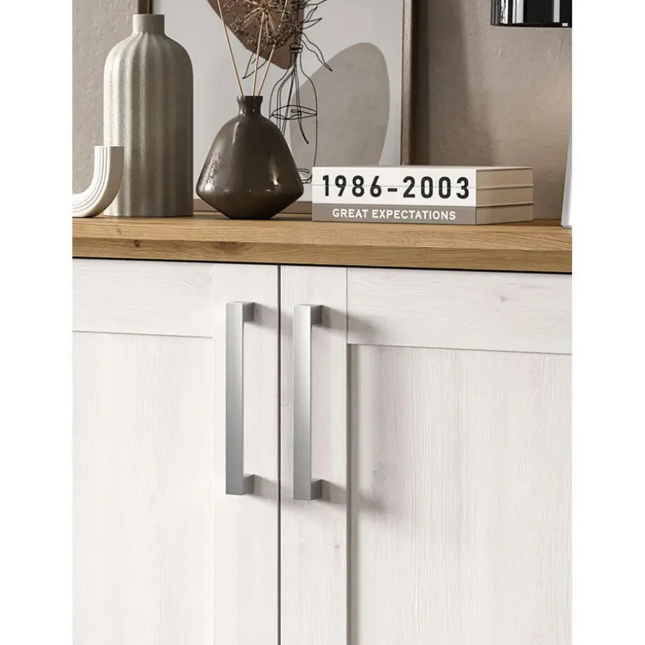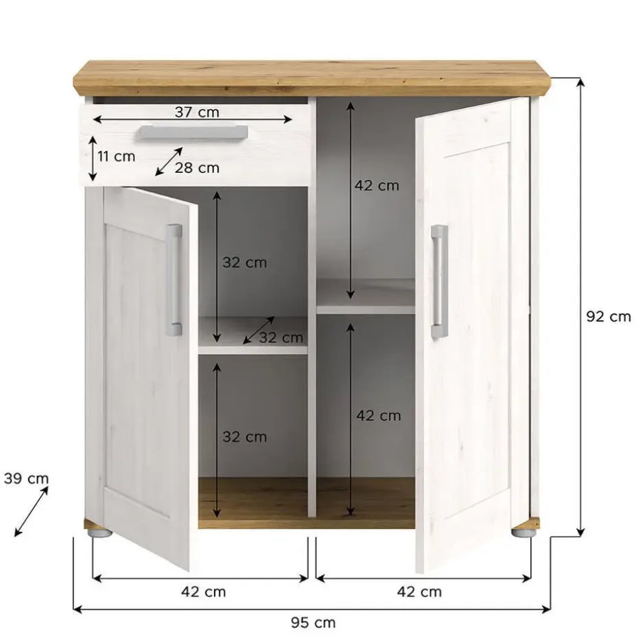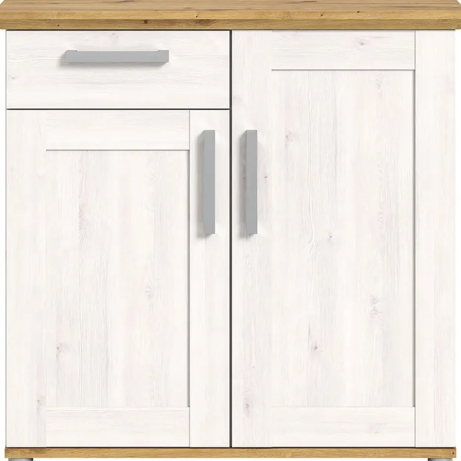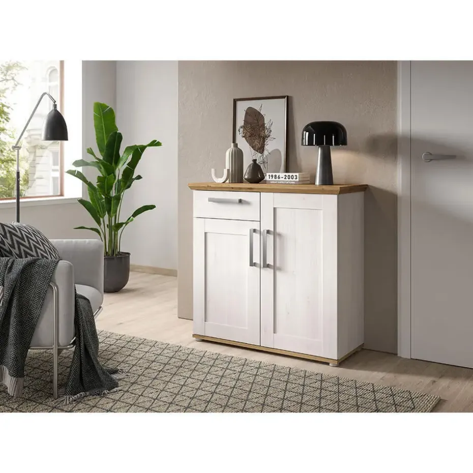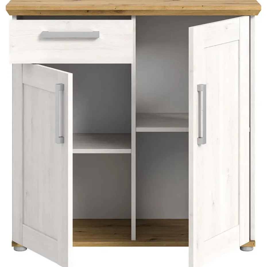Verona dressoir 1 lade 2 deuren lariks decor. Losse planken: 2. Dressoir Verona in lariksdecor is een functioneel en stijlvol meubelstuk dat perfect past in zowel kleine als grote ruimtes. Met een praktische lade en twee deuren biedt het dressoir voldoende opbergruimte voor alles, van kleding tot huishoudelijke benodigdheden. Het lichte lariksdecor geeft samen met het houtkleurige blad een natuurlijke en moderne uitstraling aan je woning. Het dressoir is voorzien van twee losse planken, waardoor je de flexibiliteit hebt om je spullen in te delen zoals jij dat wilt. Het eenvoudige ontwerp en de elegante handgrepen maken het dressoir zowel functioneel als esthetisch.