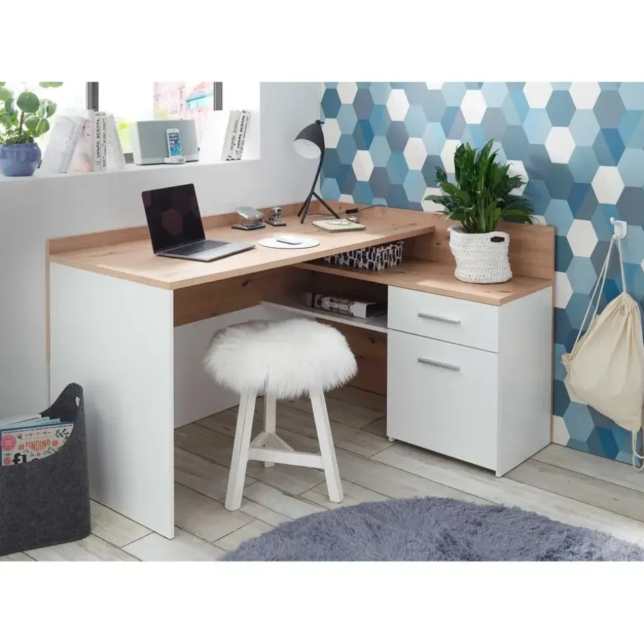 Dit hoekbureau Morkov is een prijsvriendelijk en compact bureau dat past in elk thuiskantoor. Het meubel is gefabriceerd in witte spaanplaat, het werkblad en andere accenten in artisan eikdecor. Het hoekbureau is uitgerust met een lade en een kast, elk voorzien van een metalen handgreep, en legplanken van verschillende groottes. Op die manier kan je al je documenten en spullen eenvoudig opbergen. Bovendien is er meer dan voldoende plaats om je laptop eenvoudig te kunnen gebruiken. De ideale oplossing voor elke thuiswerker of student!