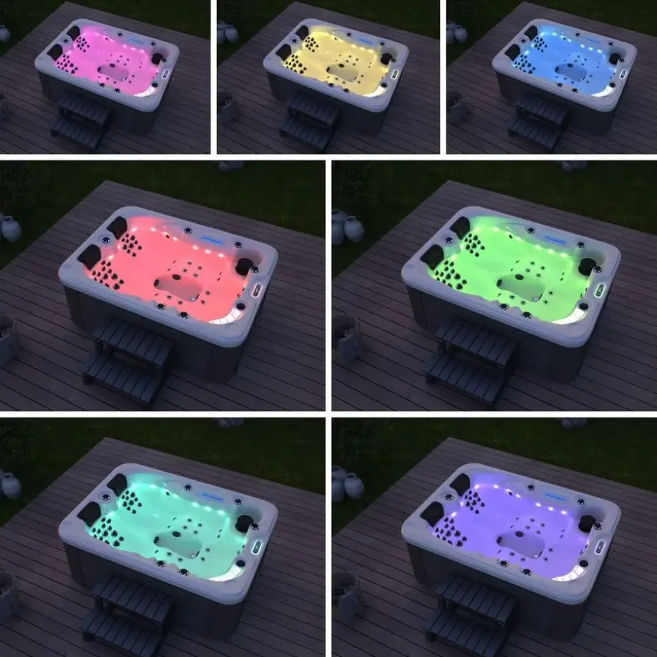 Verwen jezelf met de luxe van 51 fantastische jets die je lichaam en geest revitaliseren en zorgen voor de perfecte massage-ervaring. Elke straal kan individueel worden aangepast in intensiteit en richting door er gewoon aan te draaien. Het buitenzwembad is bijzonder opvallend dankzij de donkergrijze buitenbekleding van slijtvast WPC (met natuurvezel versterkt kunststof). De voordelen van dit materiaal: het is duurzaam, temperatuur- en vormbestendig, waterdicht, moeilijk ontvlambaar, hygiënisch en gemakkelijk schoon te maken. Bovendien vervaagt het niet, wat meestal een probleem is bij tuinproducten. Verschillende structuren van de bekleding zorgen voor dat beetje extra. Dankzij het compacte formaat past het zwembad in bijna elke tuin. De visueel en technisch hoogwaardige whirlpool kan ook op terrassen of in serres geplaatst worden. 24 lichtbronnen hebben een soortgelijk effect als gekleurde lichttherapie en kunnen naar keuze worden in- of uitgeschakeld. Naast de normale onderwaterverlichting kunnen er nog meer LED’s aan de rand worden toegevoegd. Je kunt niet alleen zittend, maar ook liggend ontspannen. Twee zwarte hoofdsteunen zorgen voor een comfortabele hoofdhouding. Via het ingebouwde display aan de rand van de whirlpool kun je verschillende functies bedienen. Je kunt hier niet alleen de temperatuur instellen, maar ook de massagejets en het licht bedienen. De circulatiepomp kun je handmatig instellen op twee verschillende snelheden. We leveren je ook een bijpassende filterset. Omdat het zwembad wordt geleverd met alle benodigde onderdelen, kun je het meteen gebruiken nadat je het hebt aangesloten op het elektriciteitsnet. Als je het bubbelbad langere tijd niet gebruikt, kun je het water gemakkelijk afvoeren via een afvoersysteem. Een ingebouwd insectengaas zorgt ervoor dat zich geen vervelende insecten kunnen verzamelen in het interieur, op de pomp of de verwarming. Koop de BEACH PURE en ervaar wat ontspanning is! LET OP