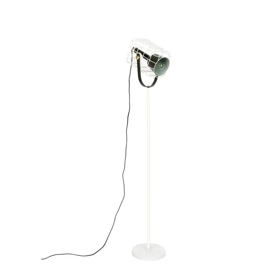 Vloerlamp Cage is een industriële lamp die geïnspireerd is op een stoere studiolamp. Cage is een serie studiolampen met voor ieder wat wils. Zo is er ook een tafellamp die zelfs op de vloer kan staan en een hanglamp. Alle Cage studiolampen zijn er met een zwarte of een witte draadmetalen kap. Beide varianten zijn voorzien van mooie messing details.