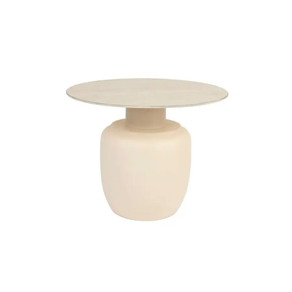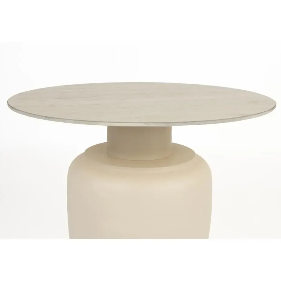 Karula is een harmonieuze mix van natuurlijke designelementen. Het keramische tafelblad heeft een prachtige travertin-look en sluit moeiteloos aan bij het metalen onderstel. De rustgevende beige tint en de organische ronde vorm maken deze serie een perfecte toevoeging aan je leefruimte.