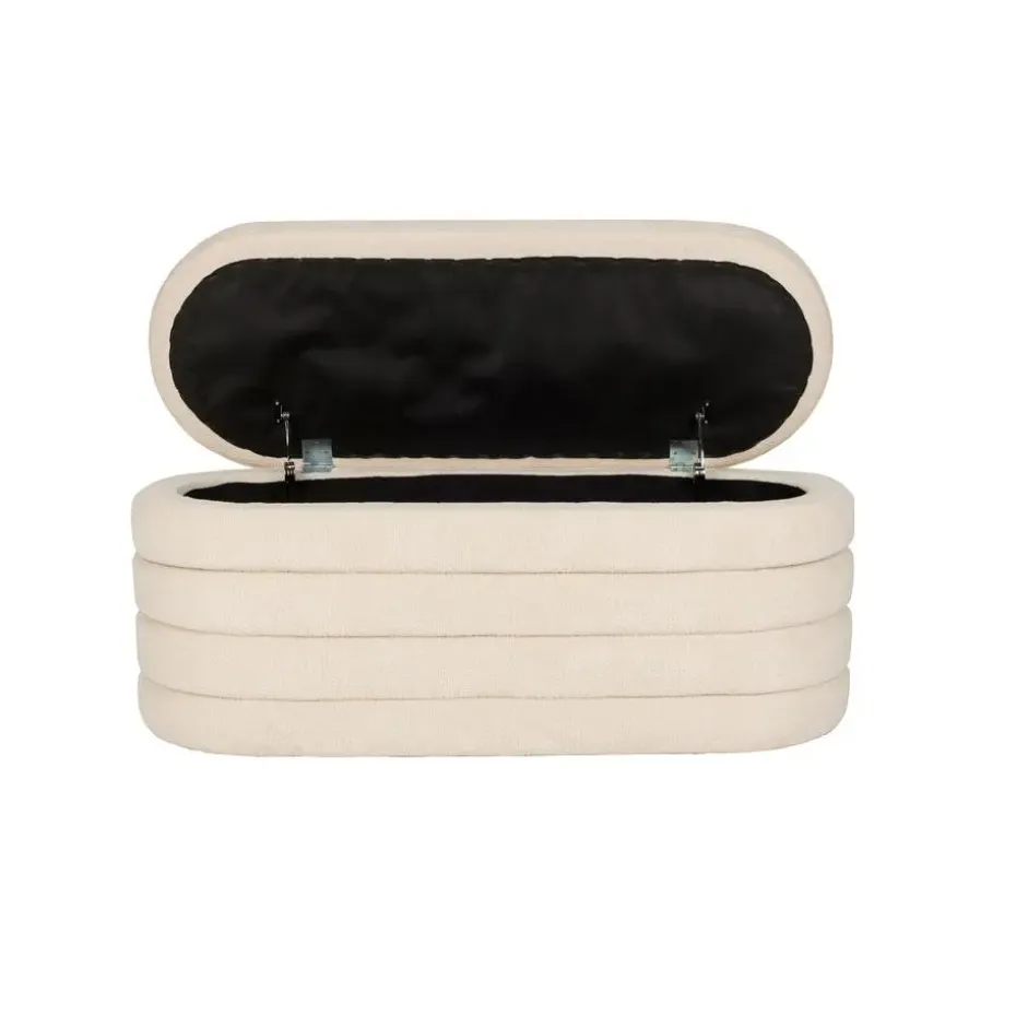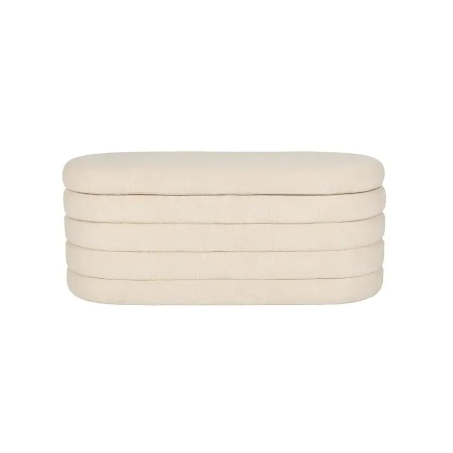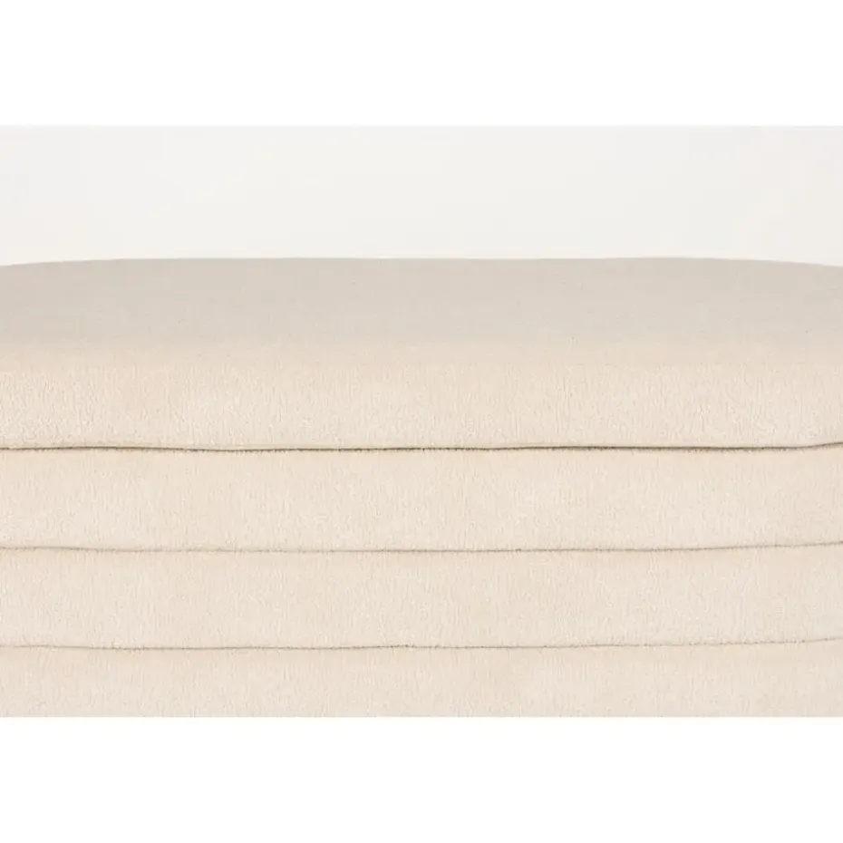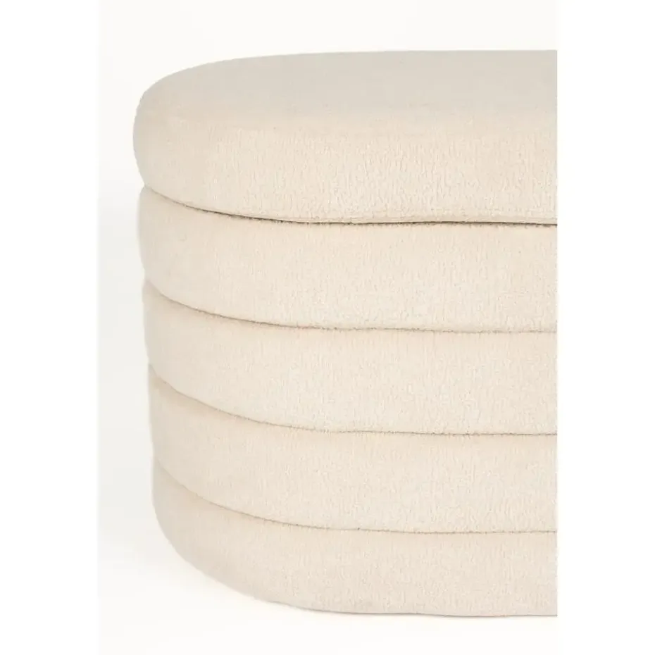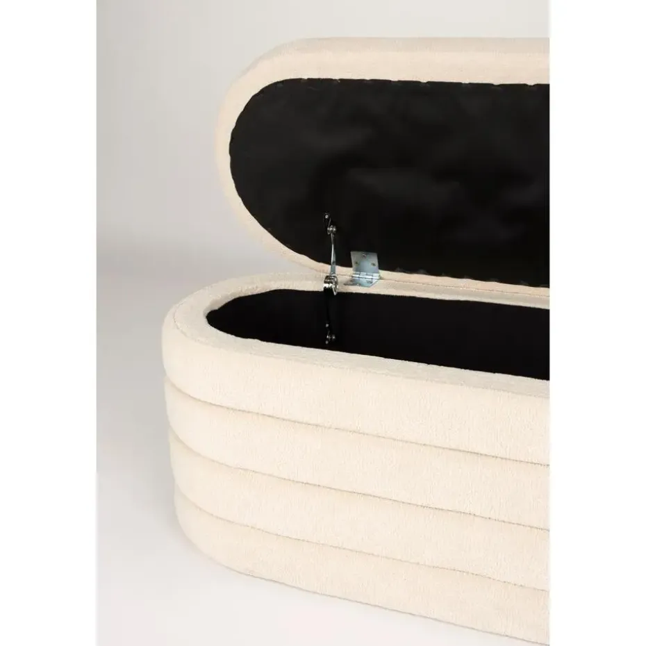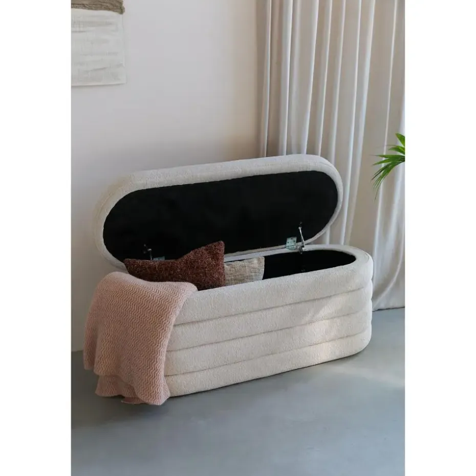 Ontdek de Zuma serie, bestaande uit een stijlvolle poef en een praktisch bankje. Beide zijn vervaardigd uit luxe bouclé wit/ beige stof en bieden een slimme opbergruimte, perfect voor elke ruimte in uw huis