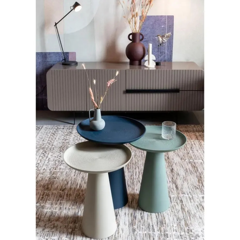 Bijzettafel Ringar is een vrolijk metalen, pion-vormig tafeltje dat helemaal in één kleur is uitgevoerd. En in de kleur heb je de keuze uit maar liefst vier trendy tinten. Opvallend is ook de mooie en subtiele structuur die in de matte poedercoating is opgenomen. Het is een cirkelpatroon dat in kringen steeds groter wordt, alsof je een steen in het water hebt gegooid, maakt dit bijzettafeltje nog interessanter.
