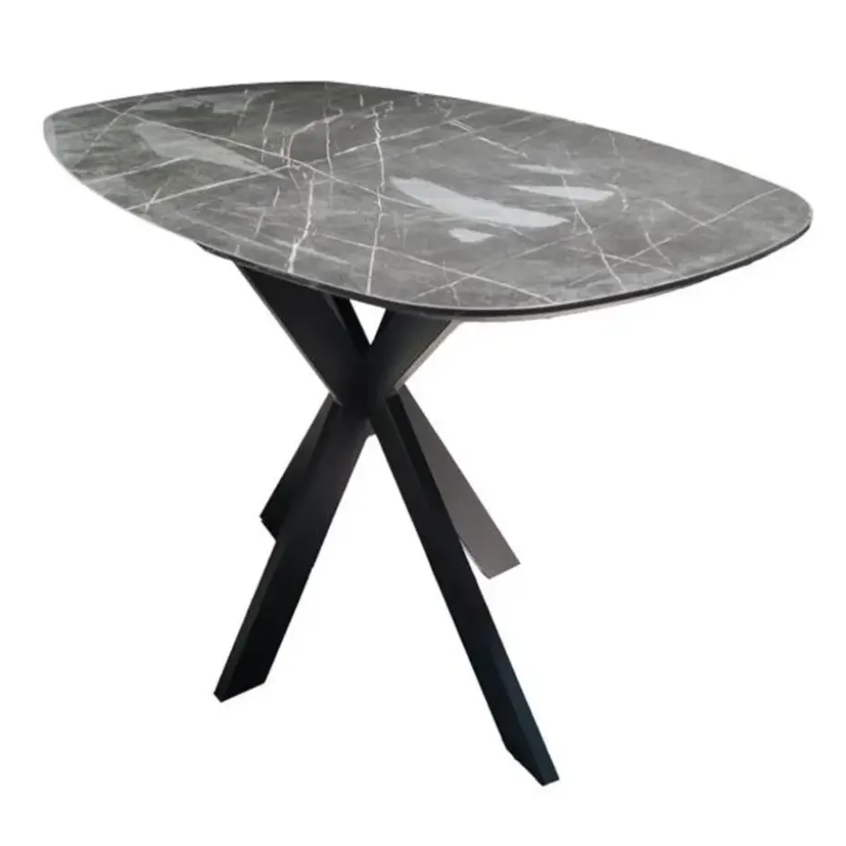 Deze bartafel is uitgevoerd in melamine met een keramiek uitstraling en een kruis frame in staal. De tafel is haast niet te onderscheiden van een keramiek tafel. Het handgemaakte tafelblad is voorzien van een laagje melaminehars dat is aangebracht op hout. Het materiaal wordt door hitte en druk aangebracht. Het prachtige materiaal in combinatie met de deens ovale vorm, geeft een trendy, maar tegelijk ook tijdloze tafel.