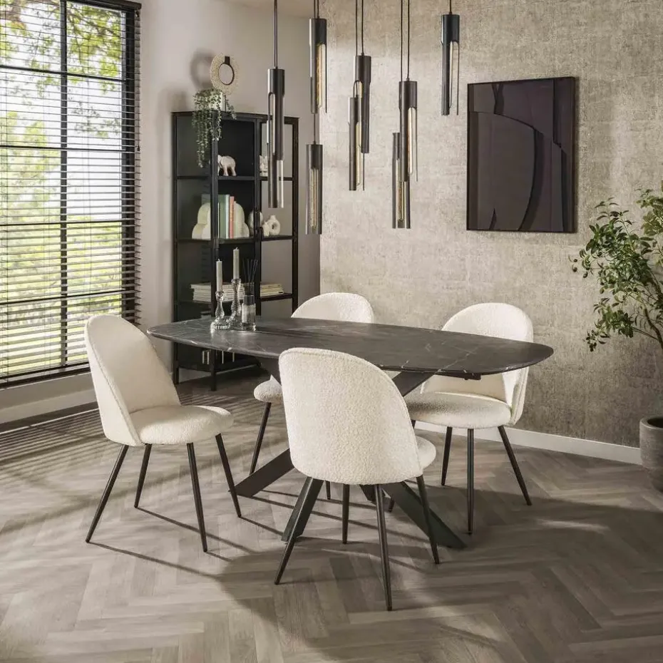 Deze eetkamertafel is uitgevoerd in melamine met een marmer uitstraling en een spider frame in staal. De tafel is haast niet te onderscheiden van een marmeren tafel. Het handgemaakte tafelblad is voorzien van een laagje melaminehars dat is aangebracht op hout. Het materiaal wordt door hitte en druk aangebracht. Het prachtige materiaal in combinatie met de deens ovale vorm, geeft een trendy, maar tegelijk ook tijdloze tafel. Deze tafel is verkrijgbaar in twee maten, namelijk 180 cm en 215 cm.
