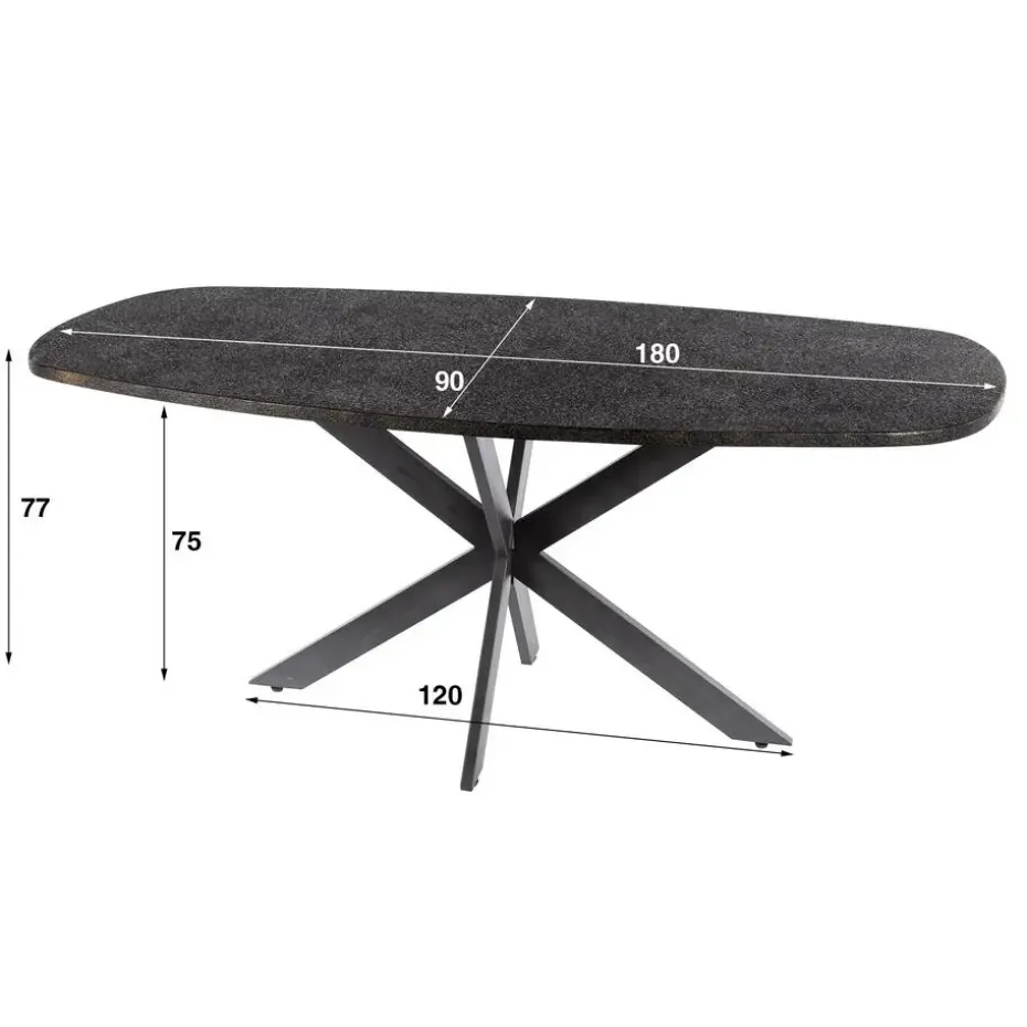 De eettafel Metallic heeft een Deens ovaal blad van 180 cm, uitgevoerd in een metallic finish. Het blad rust op een spider frame van gepoedercoat staal, dat zorgt voor een stabiele constructie en een herkenbare vormgeving. Deze tafel is ook verkrijgbaar in een lengte van 215 cm.