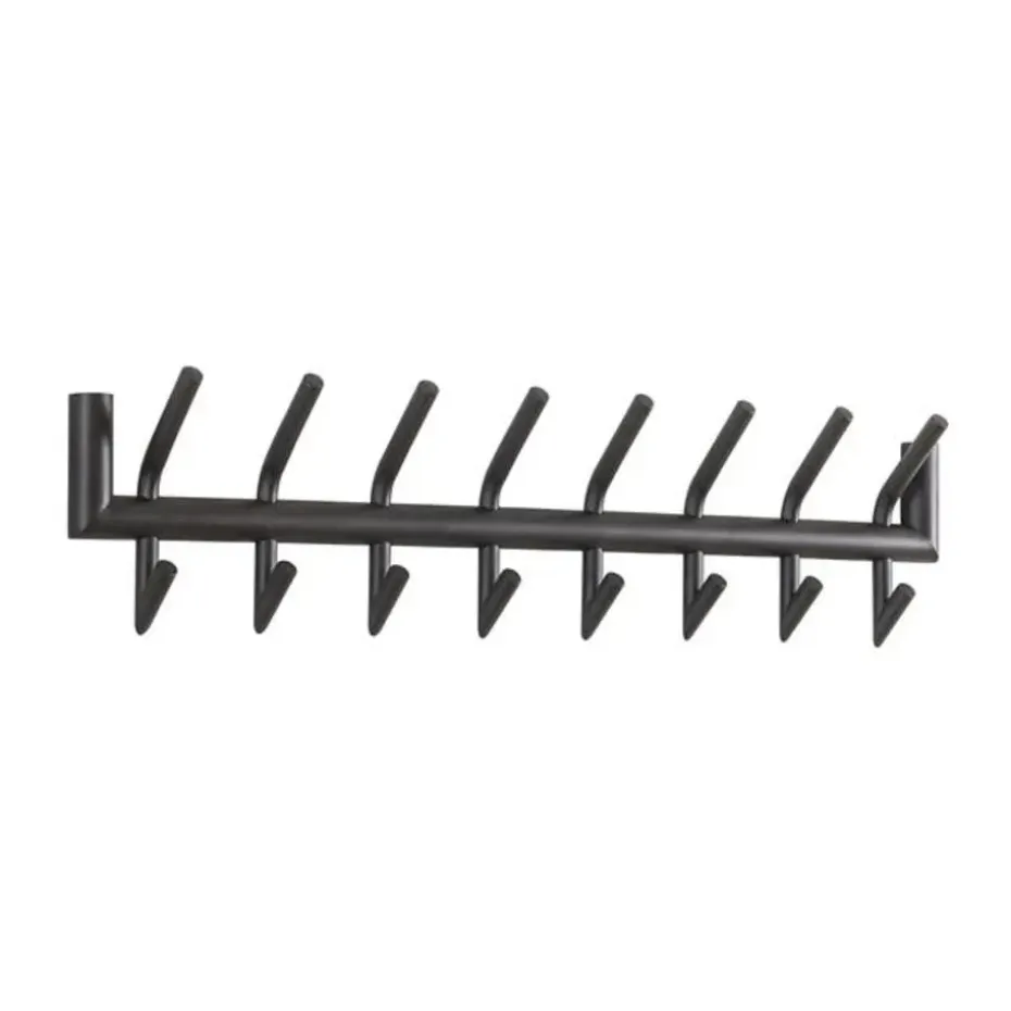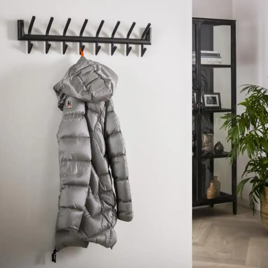 Deze kapstok heeft een ronde buis en is uitgevoerd in grijs gepoedercoat staal. In totaal is dit model voorzien van 16 haakjes met zowel bovenkant als aan de onderkant een ophangsysteem. De kapstok is verder voorzien van twee bevestigingsogen aan de achterzijde, zodat hij eenvoudig aan de wand kan worden gemonteerd. Deze kapstok heeft ook een 6- haaks uitvoering.