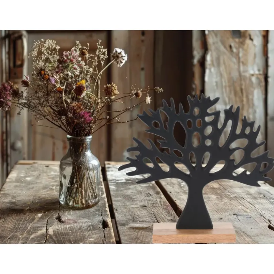 Voeg een vleugje symboliek en natuurlijke schoonheid toe aan je interieur met deze decoratieve levensboom, ook wel bekend als de Tree of Life. Dit kunstwerk is gemaakt uit een combinatie van aluminium en mango hout, wat zorgt voor een opvallende en stijlvolle uitstraling. Met afmetingen van 27 x 25 cm is dit decoratieve stuk compact genoeg om op een schouw, bijzettafel of boekenplank te plaatsen, terwijl het toch een krachtige visuele impact maakt. De levensboom staat symbool voor groei, kracht en verbinding, wat een diepere betekenis toevoegt aan je woonruimte. Voeg deze prachtige Tree of Life toe aan je decoratie en geniet van de visuele en spirituele rijkdom die het met zich meebrengt. Materiaal: aluminium/mango hout. Afmeting: ca. 27 x 25 cm. Kleur: zwart.