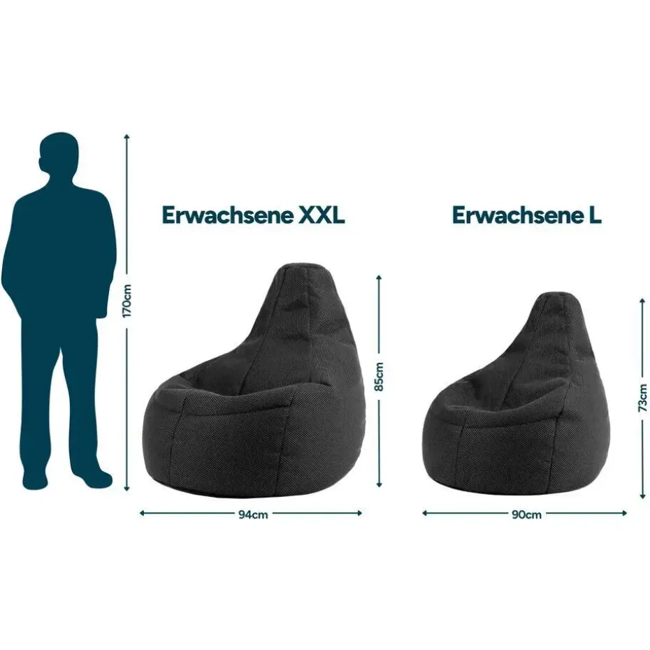 EUROPESE KWALITEIT; Onze luxe zitzakken zijn ontworpen en vervaardigd in Duitsland. Ze zijn gemaakt van stof van de hoogste kwaliteit met overlockstiksels, met een dubbele ritssluiting voor de veiligheid en beveiliging van de bonenvulling.