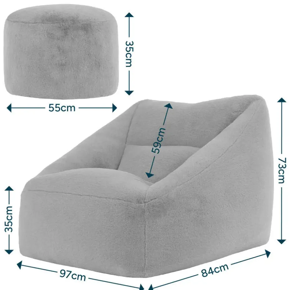 ONDERSTEUNENDE FAUTEUILVORM MET BIJPASSENDE POEF: Deze comfortabele zitzak wordt geleverd met een bijpassende poef voor extra luxe. De zitzak heeft een ondersteunende zitting, een innovatief paneelontwerp en een slimme interne stofstructuur om zijn verfijnde vorm te behouden. Vanwege de aard van met bonen gevulde producten kunnen de afmetingen enigszins variëren.