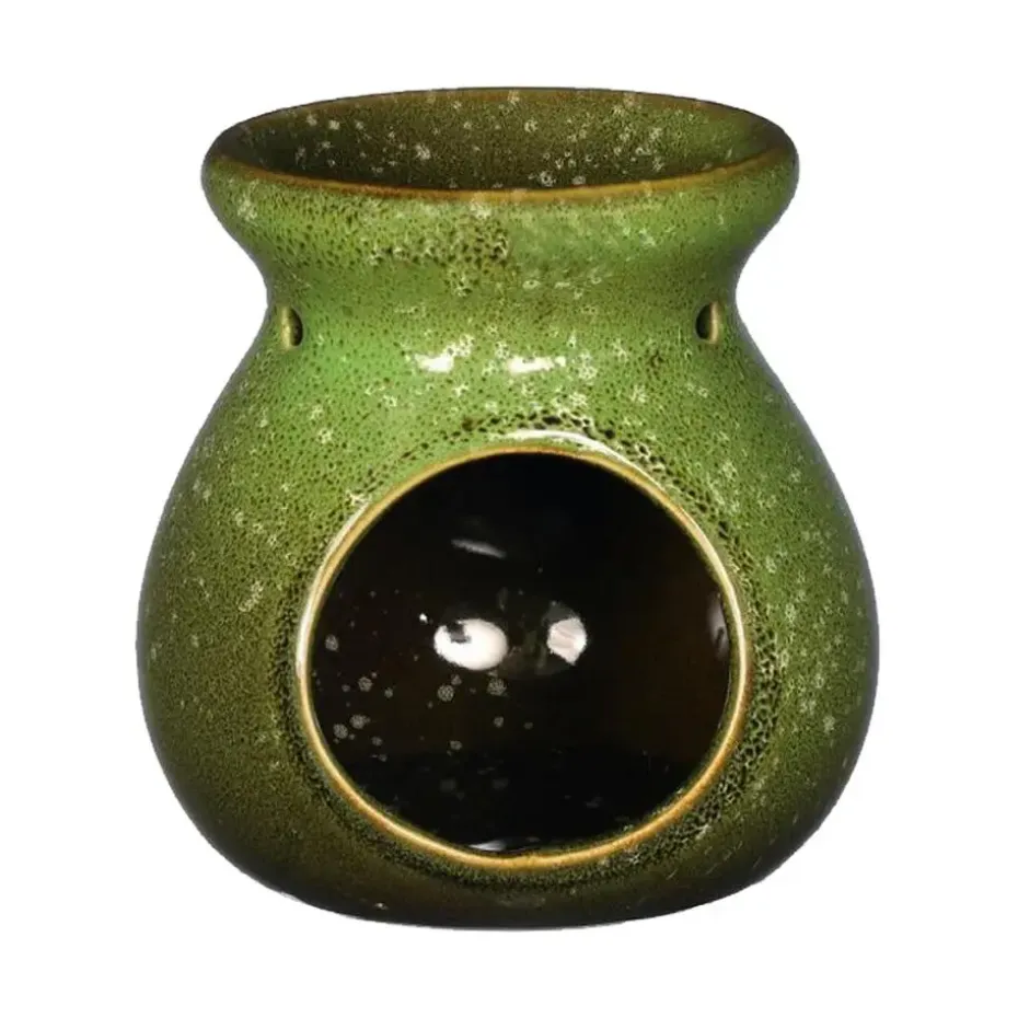 Geurbrander voor amberblokjes/geurolie. De brander is van keramiek in de kleur groen. Door onderin een waxinelichtje te plaatsen en in het schaaltje (een stukje van) het geurblokje of de geurolie, zal de geur zich heerlijk verspreiden door de ruimte. Eindeloos varieren met de heerlijkste geuren amberblokjes, waxmelts of geurolie. Formaat: D10 x H10 cm. Materiaal: keramiek.