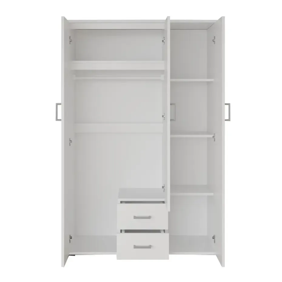 De Interiax Kledingkast ‘Lena’ in wit is een stijlvolle en functionele kast die royale opbergruimte biedt. Met afmetingen van 185x120x52 cm is deze kast perfect voor het overzichtelijk opbergen van kleding en accessoires. De kast beschikt over 3 deuren, 2 lades voor kleinere items, 1 hanger voor kleding, 4 legplanken voor gevouwen kleding, en een handige spiegel op de deur. Het strakke, witte design geeft de kast een frisse uitstraling die naadloos past bij diverse interieurstijlen, van modern tot klassiek.
