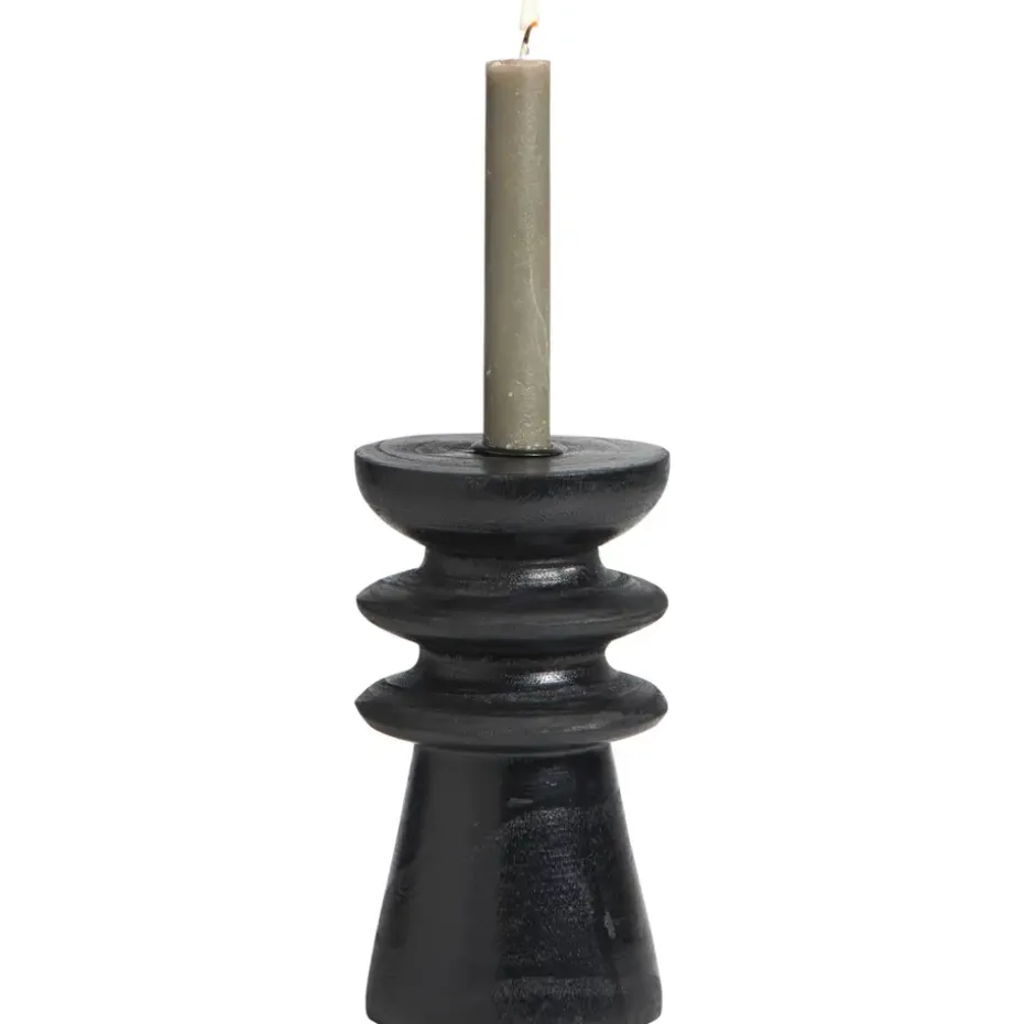 Kandelaar Paula is gemaakt van zwart hout en valt op door haar organische vormen die zorgen voor een natuurlijke en elegante uitstraling. Met een hoogte van 18 cm en een diameter van 10 cm is deze kandelaar compact maar stijlvol, perfect voor het creëren van een warme sfeer in huis. De vloeiende lijnen en het matte zwarte hout maken dit een tijdloos decoratiestuk dat moeiteloos past bij zowel moderne als landelijke interieurs. Ideaal op een eettafel, dressoir of als onderdeel van een sfeervolle opstelling. Kandelaar Paula brengt warmte, stijl en een natuurlijk accent in elke ruimte.