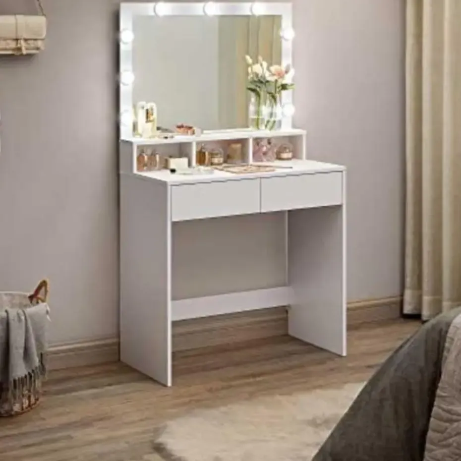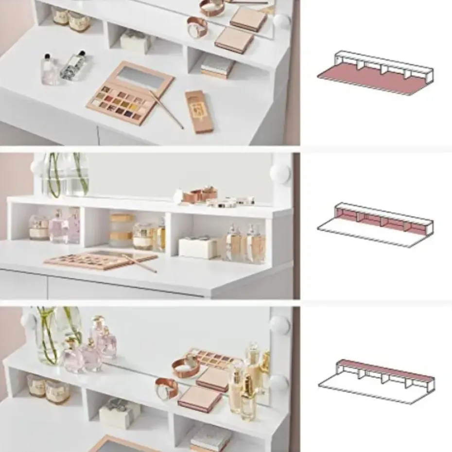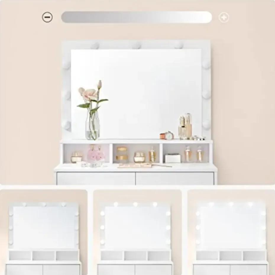 Op zoek naar een chique en stijlvolle kaptafel om je kamer op te sieren? Kijk dan niet verder dan onze moderne en elegante kaptafel in wit met 9 LED lampen en spiegel met instelbare helderheid, 2 laden en 3 open laden. Deze kaptafel wordt geleverd met 9 dimbare lampen rondom de spiegel voor perfecte verlichting terwijl je je make-up aanbrengt. Er is zeker meer opbergcapaciteit dankzij de 2 grote lades en 3 open vakken die je genoeg ruimte geven voor al je cosmetica. De witte kleur en het moderne ontwerp van de kaptafel maken hem perfect passend in je kamer en je kunt hem naar wens in de hoek of naast het bed plaatsen. Bovendien wordt hij geleverd met makkelijk te volgen instructies en duidelijk gemarkeerde onderdelen die een probleemloze montage mogelijk maken. Verder maakt de melamine coating van het tafelblad het makkelijk schoon te maken zonder rommel van verspreide poeder en oogschaduw. De kaptafel heeft een statisch draagvermogen van 27 kg en wordt geleverd in het volgende pakket: kaptafel, 9 LED-lampjes, montagekit, anti-tipkit en instructies.