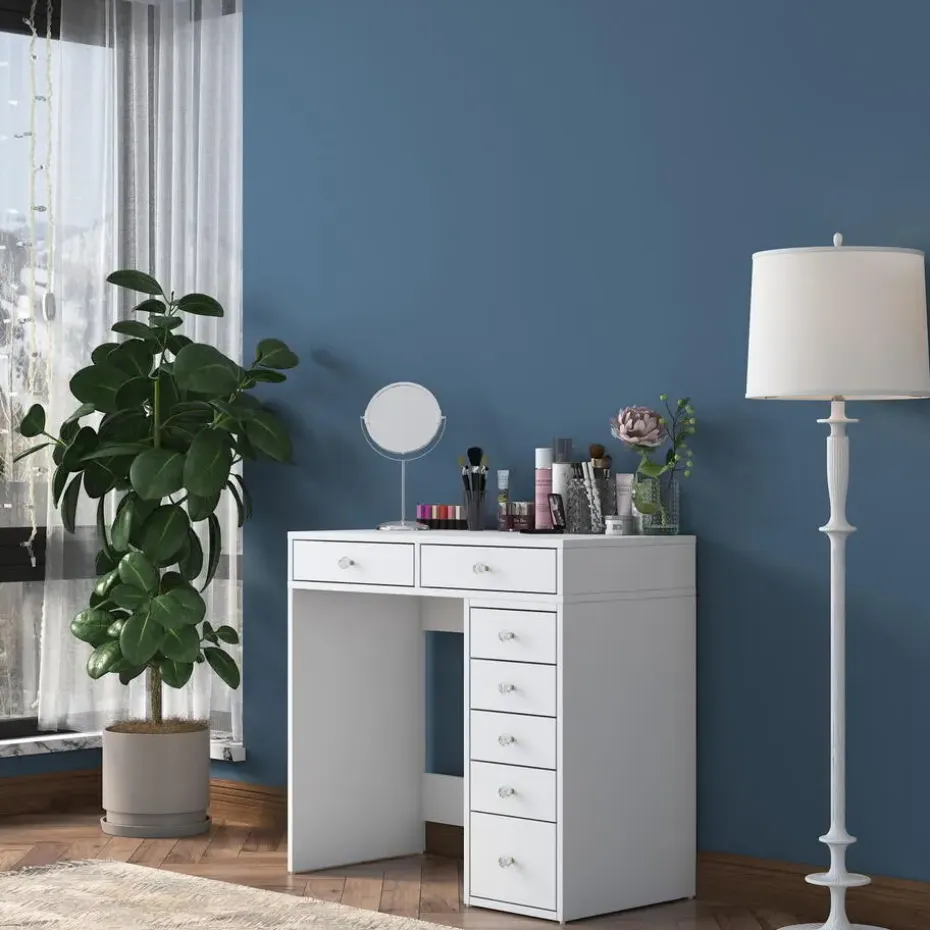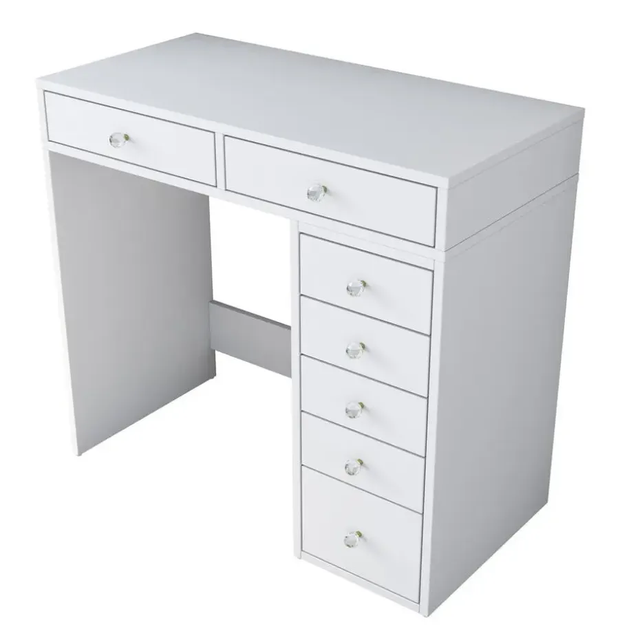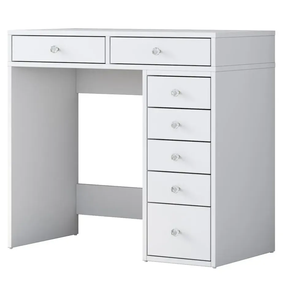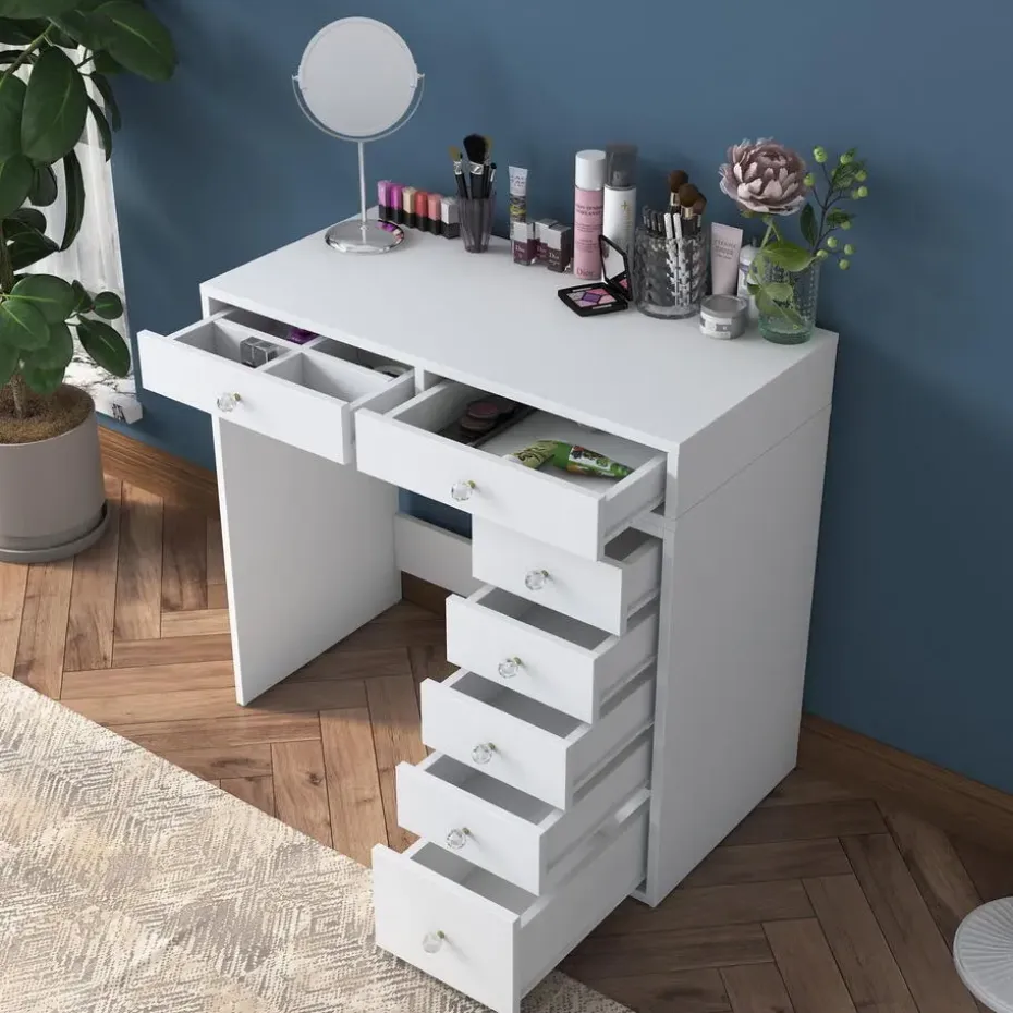 Materiaal: De kaptafel is vervaardigd uit melamine, een materiaal dat bekend staat om zijn duurzaamheid en onderhoudsgemak. Melamine is krasbestendig en eenvoudig schoon te maken, waardoor het ideaal is voor dagelijks gebruik in drukke huishoudens.