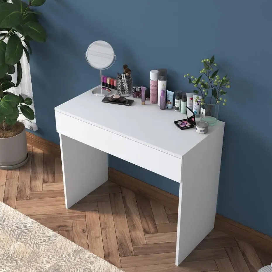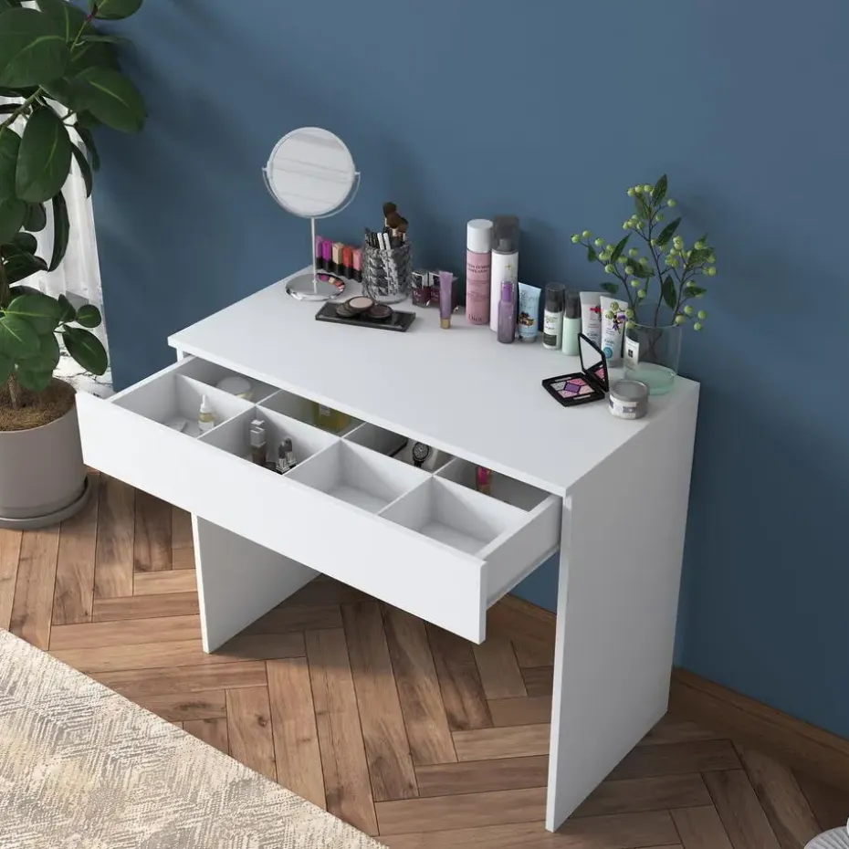 Met zijn compacte afmetingen past de Kaptafel Bengisu perfect in kleinere ruimtes zonder in te boeten aan functionaliteit. Bestel jouw Kaptafel Bengisu Wit vandaag nog en profiteer van gratis bezorging. Voeg een vleugje elegantie toe aan je interieur met deze prachtige kaptafel!