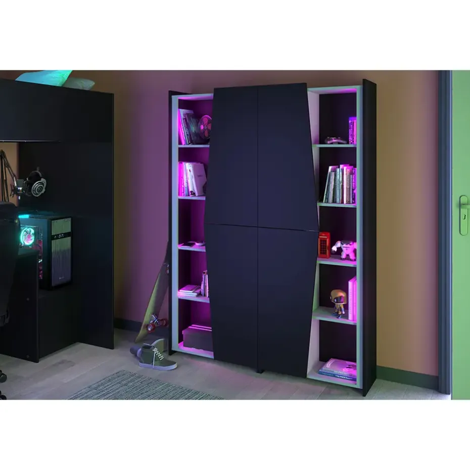 De kast heeft planken met led verlichting en bevat een open kant en een kant met een deur, wat de kast een extra stoere look geeft. Combineer deze kast met hoogslaper Levi voor een stoere game kamer!